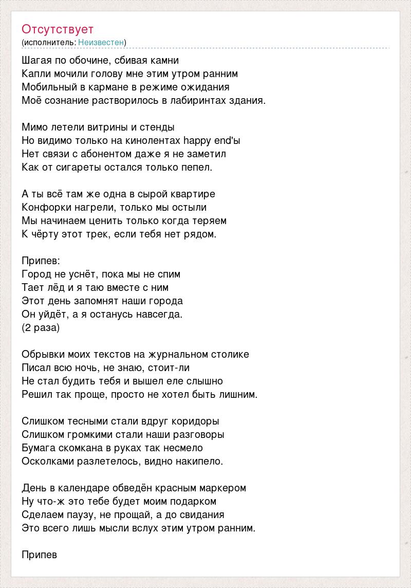 Шагая по обочине, сбивая камни Капли мочили голову мне этим утром ранним Мобильный в кармане в режиме ожидания Моё сознание растворилось в лабиринтах здания. Мимо летели витрины и стенды Но видимо только на кинолентах happy end'ы Нет связи с абонентом даже я не заметил Как от сигареты остался только пепел. А ты всё там же одна в сырой квартире Конфорки нагрели, только мы остыли Мы начинаем ценить только когда теряем К чёрту этот трек, если тебя нет рядом. Припев: Город не уснёт, пока мы не спим Тает лёд и я таю вместе с ним Этот день запомнят наши города Он уйдёт, а я останусь навсегда. (2 раза) Обрывки моих текстов на журнальном столике Писал всю ночь, не знаю, стоит-ли Не стал будить тебя и вышел еле слышно Решил так проще, просто не хотел быть лишним. Слишком тесными стали вдруг коридоры Слишком громкими стали наши разговоры Бумага скомкана в руках так несмело Осколками разлетелось, видно накипело. День в календаре обведён красным маркером Ну что-ж это тебе будет моим подарком Сделаем паузу, не прощай, а до свидания Это всего лишь мысли вслух этим утром ранним. Припев