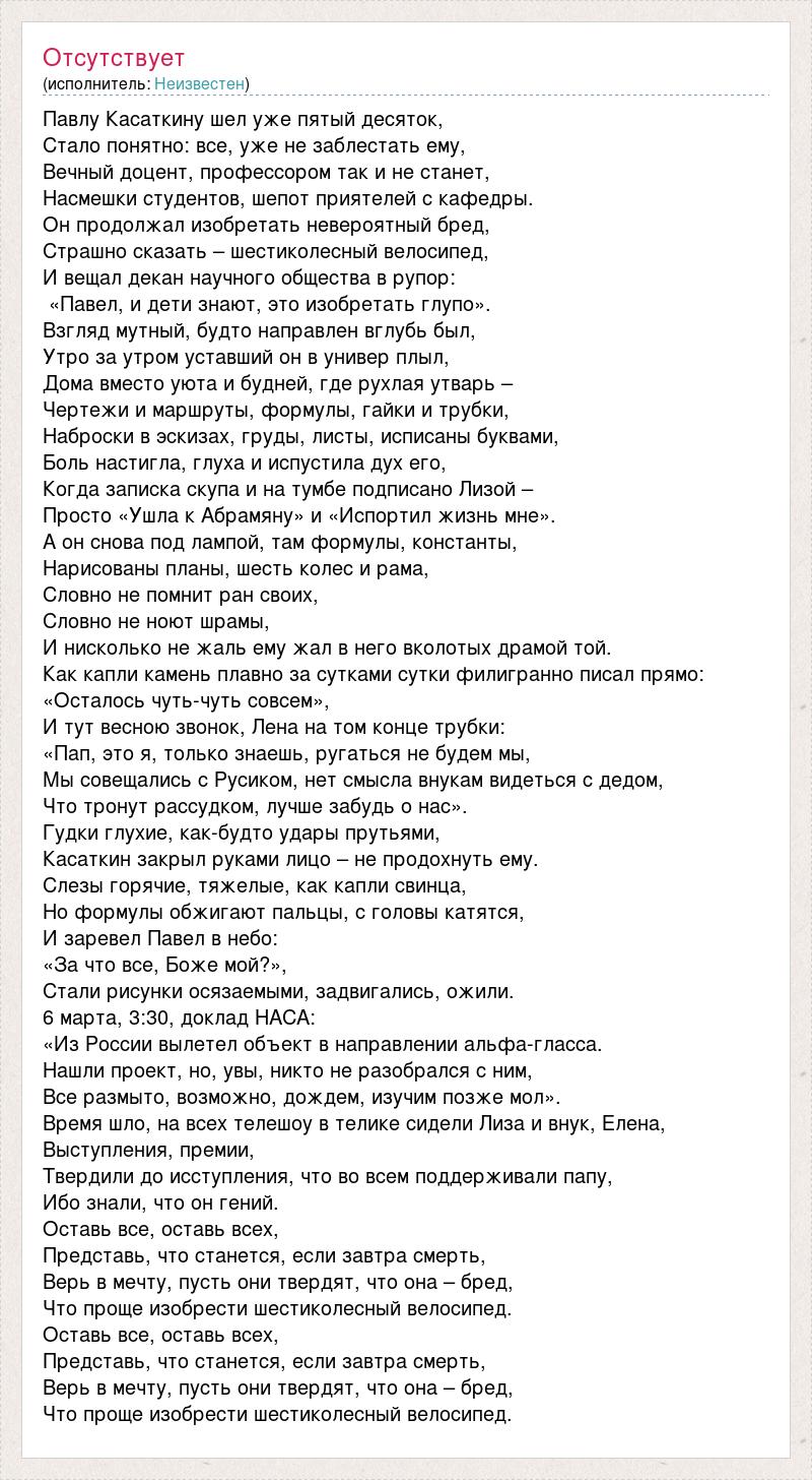Павлу Касаткину шел уже пятый десяток, Стало понятно: все, уже не заблестать ему, Вечный доцент, профессором так и не станет, Насмешки студентов, шепот приятелей с кафедры. Он продолжал изобретать невероятный бред, Страшно сказать – шестиколесный велосипед, И вещал декан научного общества в рупор: «Павел, и дети знают, это изобретать глупо». Взгляд мутный, будто направлен вглубь был, Утро за утром уставший он в универ плыл, Дома вместо уюта и будней, где рухлая утварь – Чертежи и маршруты, формулы, гайки и трубки, Наброски в эскизах, груды, листы, исписаны буквами, Боль настигла, глуха и испустила дух его, Когда записка скупа и на тумбе подписано Лизой – Просто «Ушла к Абрамяну» и «Испортил жизнь мне». А он снова под лампой, там формулы, константы, Нарисованы планы, шесть колес и рама, Словно не помнит ран своих, Словно не ноют шрамы, И нисколько не жаль ему жал в него вколотых драмой той. Как капли камень плавно за сутками сутки филигранно писал прямо: «Осталось чуть-чуть совсем», И тут весною звонок, Лена на том конце трубки: «Пап, это я, только знаешь, ругаться не будем мы, Мы совещались с Русиком, нет смысла внукам видеться с дедом, Что тронут рассудком, лучше забудь о нас». Гудки глухие, как-будто удары прутьями, Касаткин закрыл руками лицо – не продохнуть ему. Слезы горячие, тяжелые, как капли свинца, Но формулы обжигают пальцы, с головы катятся, И заревел Павел в небо: «За что все, Боже мой?», Стали рисунки осязаемыми, задвигались, ожили. 6 марта, 3:30, доклад НАСА: «Из России вылетел объект в направлении альфа-гласса. Нашли проект, но, увы, никто не разобрался с ним, Все размыто, возможно, дождем, изучим позже мол». Время шло, на всех телешоу в телике сидели Лиза и внук, Елена, Выступления, премии, Твердили до исступления, что во всем поддерживали папу, Ибо знали, что он гений. Оставь все, оставь всех, Представь, что станется, если завтра смерть, Верь в мечту, пусть они твердят, что она – бред, Что проще изобрести шестиколесный велосипед. Оставь все, оставь всех, Представь, что станется, если завтра смерть, Верь в мечту, пусть они твердят, что она – бред, Что проще изобрести шестиколесный велосипед.