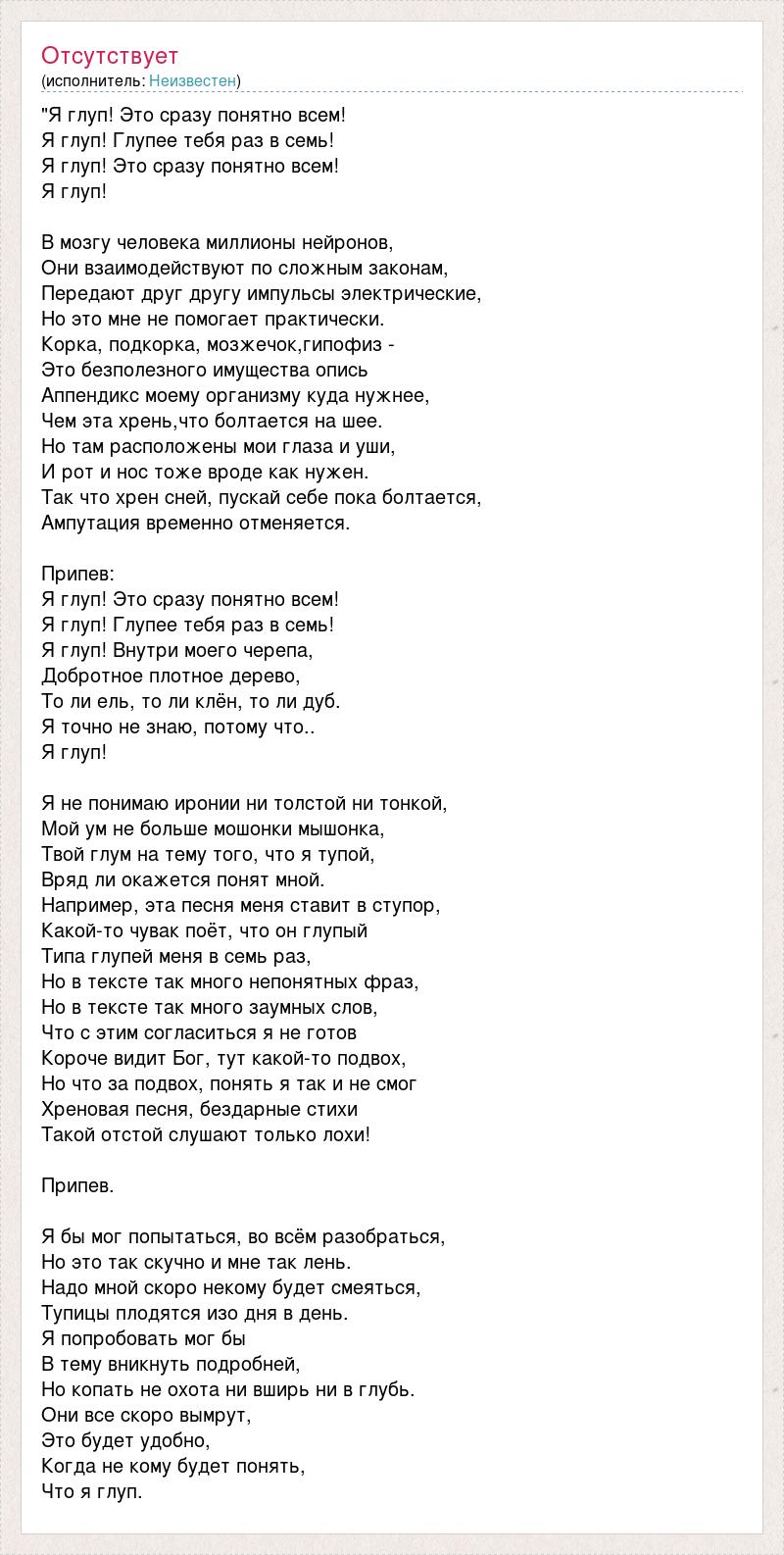 "Я глуп! Это сразу понятно всем! Я глуп! Глупее тебя раз в семь! Я глуп! Это сразу понятно всем! Я глуп! В мозгу человека миллионы нейронов, Они взаимодействуют по сложным законам, Передают друг другу импульсы электрические, Но это мне не помогает практически. Корка, подкорка, мозжечок,гипофиз - Это безполезного имущества опись Аппендикс моему организму куда нужнее, Чем эта хрень,что болтается на шее. Но там расположены мои глаза и уши, И рот и нос тоже вроде как нужен. Так что хрен сней, пускай себе пока болтается, Ампутация временно отменяется. Припев: Я глуп! Это сразу понятно всем! Я глуп! Глупее тебя раз в семь! Я глуп! Внутри моего черепа, Добротное плотное дерево, То ли ель, то ли клён, то ли дуб. Я точно не знаю, потому что.. Я глуп! Я не понимаю иронии ни толстой ни тонкой, Мой ум не больше мошонки мышонка, Твой глум на тему того, что я тупой, Вряд ли окажется понят мной. Например, эта песня меня ставит в ступор, Какой-то чувак поёт, что он глупый Типа глупей меня в семь раз, Но в тексте так много непонятных фраз, Но в тексте так много заумных слов, Что с этим согласиться я не готов Короче видит Бог, тут какой-то подвох, Но что за подвох, понять я так и не смог Хреновая песня, бездарные стихи Такой отстой слушают только лохи! Припев. Я бы мог попытаться, во всём разобраться, Но это так скучно и мне так лень. Надо мной скоро некому будет смеяться, Тупицы плодятся изо дня в день. Я попробовать мог бы В тему вникнуть подробней, Но копать не охота ни вширь ни в глубь. Они все скоро вымрут, Это будет удобно, Когда не кому будет понять, Что я глуп.