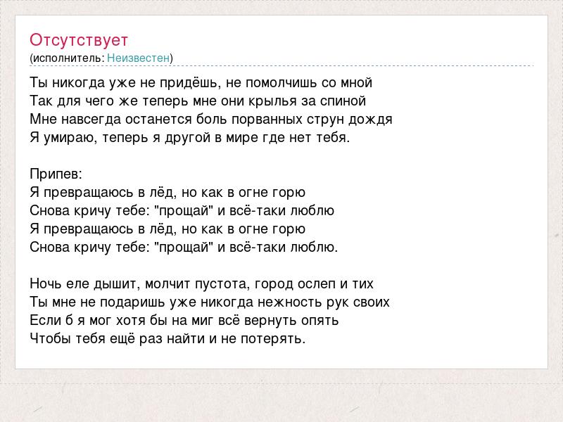 Ты никогда уже не придёшь, не помолчишь со мной Так для чего же теперь мне они крылья за спиной Мне навсегда останется боль порванных струн дождя Я умираю, теперь я другой в мире где нет тебя. Припев: Я превращаюсь в лёд, но как в огне горю Снова кричу тебе: "прощай" и всё-таки люблю Я превращаюсь в лёд, но как в огне горю Снова кричу тебе: "прощай" и всё-таки люблю. Ночь еле дышит, молчит пустота, город ослеп и тих Ты мне не подаришь уже никогда нежность рук своих Если б я мог хотя бы на миг всё вернуть опять Чтобы тебя ещё раз найти и не потерять.