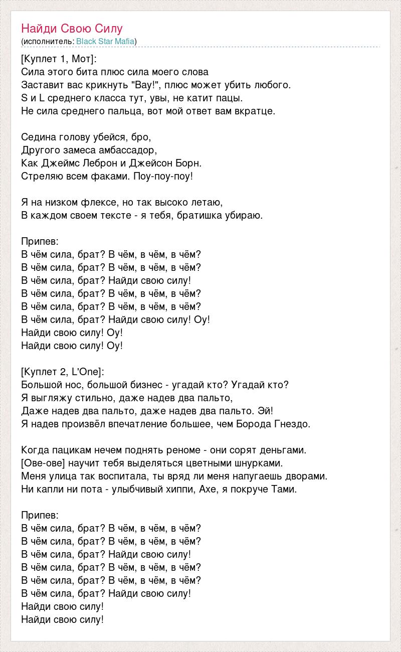 [Куплет 1, Мот]: Сила этого бита плюс сила моего слова Заставит вас крикнуть "Вау!", плюс может убить любого. S и L среднего класса тут, увы, не катит пацы. Не сила среднего пальца, вот мой ответ вам вкратце. Седина голову убейся, бро, Другого замеса амбассадор, Как Джеймс Леброн и Джейсон Борн. Стреляю всем факами. Поу-поу-поу! Я на низком флексе, но так высоко летаю, В каждом своем тексте - я тебя, братишка убираю. Припев: В чём сила, брат? В чём, в чём, в чём? В чём сила, брат? В чём, в чём, в чём? В чём сила, брат? Найди свою силу! В чём сила, брат? В чём, в чём, в чём? В чём сила, брат? В чём, в чём, в чём? В чём сила, брат? Найди свою силу! Оу! Найди свою силу! Оу! Найди свою силу! Оу! [Куплет 2, L'One]: Большой нос, большой бизнес - угадай кто? Угадай кто? Я выгляжу стильно, даже надев два пальто, Даже надев два пальто, даже надев два пальто. Эй! Я надев произвёл впечатление большее, чем Борода Гнездо. Когда пацикам нечем поднять реноме - они сорят деньгами. [Ове-ове] научит тебя выделяться цветными шнурками. Меня улица так воспитала, ты вряд ли меня напугаешь дворами. Ни капли ни пота - улыбчивый хиппи, Axe, я покруче Тами. Припев: В чём сила, брат? В чём, в чём, в чём? В чём сила, брат? В чём, в чём, в чём? В чём сила, брат? Найди свою силу! В чём сила, брат? В чём, в чём, в чём? В чём сила, брат? В чём, в чём, в чём? В чём сила, брат? Найди свою силу! Найди свою силу! Найди свою силу!