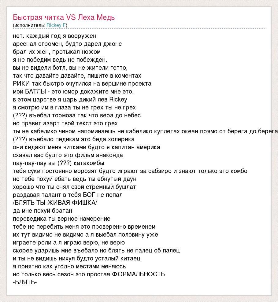 нет. каждый год я вооружен арсенал огромен, будто дарел джонс брал их жен, протыкал ножом я не победим ведь не побежден. вы не видели бэтл, вы не жители гетто, так что давайте давайте, пишите в коментах РИКИ так быстро очутился на вершине проекта мои БАТЛЫ - это юмор докажите мне это. в этом царстве я царь дикий лев Rickey я смотрю им в глаза ты не грех ты не грех (???) въебал тормоза так что вера до небес но правит азарт твой текст это грех ты не кабелико чином напоминаешь не кабелико куплетах океан прямо от берега до берега (???) въебало педикам это беда холерика они кидают меня читками будто я капитан америка схавал вас будто это фильм анаконда пау-пау-пау вы (???) катакомбы тебя суки постоянно морозят будто играют за сабзиро и знают только это комбо но тебе похуй ебать ведь ты ебнутый даун хорошо что ты снял свой стремный бушлат раздавая талант в тебя БОГ не попал /БЛЯТЬ ТЫ ЖИВАЯ ФИШКА/ да мне похуй братан переведика ты верное намерение тебе не перебить меня это проверенно временем их тут видимо не видимо а я выебал половину уже играете роли а я играю верю, не верю скорее ударишь мне въебало но блять не палец об палец и ты не видишь нихуя будто усталый китаец я понятно как угодно местами меняюсь но только весь сезон это простая ФОРМАЛЬНОСТЬ -БЛЯТЬ-