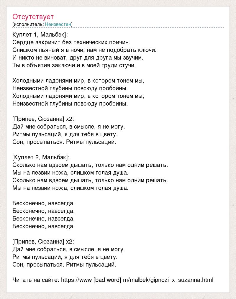Куплет 1, Мальбэк]: Сердце закричит без технических причин. Слишком пьяный я в ночи, нам не подобрать ключи. И никто не виноват, друг для друга мы звучим. Ты в объятия заключи и в моей груди стучи. Холодными ладонями мир, в котором тонем мы, Неизвестной глубины повсюду пробоины. Холодными ладонями мир, в котором тонем мы, Неизвестной глубины повсюду пробоины. [Припев, Сюзанна] х2: Дай мне собраться, в смысле, я не могу. Ритмы пульсаций, я для тебя в цвету. Сон, просыпаться. Ритмы пульсаций. [Куплет 2, Мальбэк]: Сколько нам вдвоем дышать, только нам одним решать. Мы на лезвии ножа, слишком голая душа. Сколько нам вдвоем дышать, только нам одним решать. Мы на лезвии ножа, слишком голая душа. Бесконечно, навсегда. Бесконечно, навсегда. Бесконечно, навсегда. Бесконечно, навсегда. [Припев, Сюзанна] х2: Дай мне собраться, в смысле, я не могу. Ритмы пульсаций, я для тебя в цвету. Сон, просыпаться. Ритмы пульсаций. Читать на сайте: https://www [bad word] m/malbek/gipnozi_x_suzanna.html