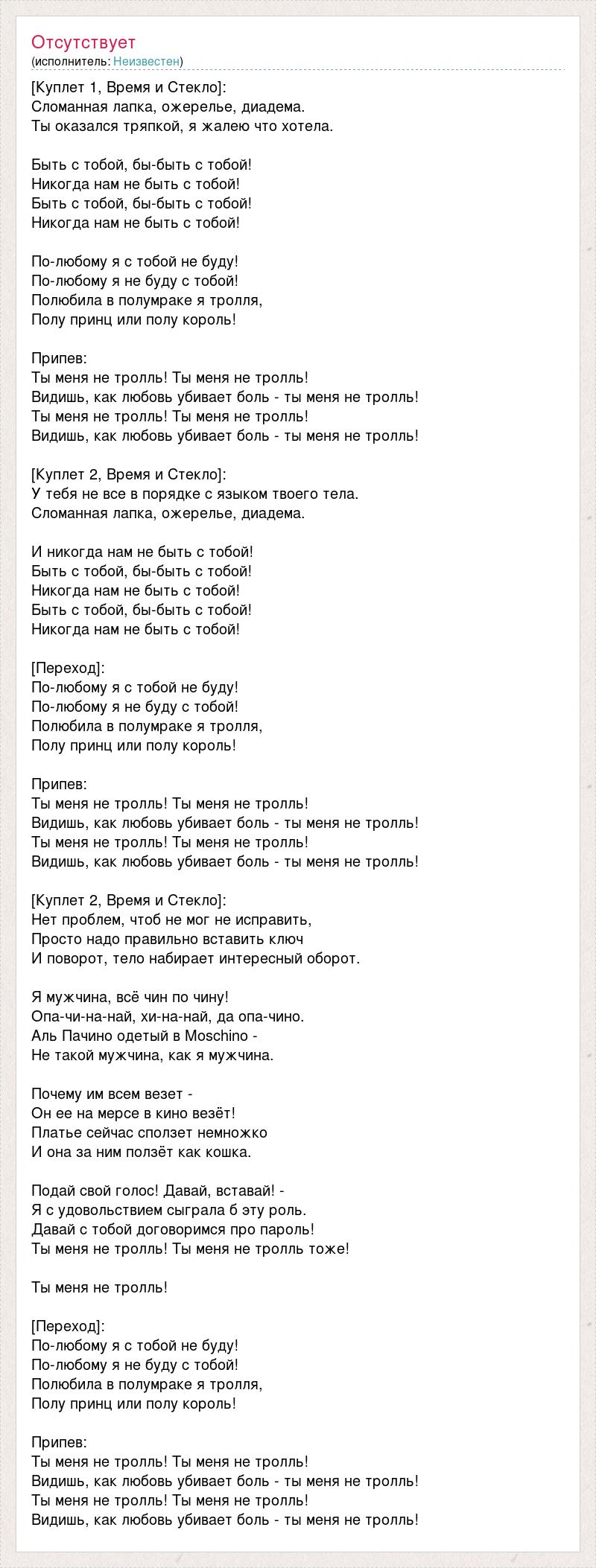 [Куплет 1, Время и Стекло]: Сломанная лапка, ожерелье, диадема. Ты оказался тряпкой, я жалею что хотела. Быть с тобой, бы-быть с тобой! Никогда нам не быть с тобой! Быть с тобой, бы-быть с тобой! Никогда нам не быть с тобой! По-любому я с тобой не буду! По-любому я не буду с тобой! Полюбила в полумраке я тролля, Полу принц или полу король! Припев: Ты меня не тролль! Ты меня не тролль! Видишь, как любовь убивает боль - ты меня не тролль! Ты меня не тролль! Ты меня не тролль! Видишь, как любовь убивает боль - ты меня не тролль! [Куплет 2, Время и Стекло]: У тебя не все в порядке с языком твоего тела. Сломанная лапка, ожерелье, диадема. И никогда нам не быть с тобой! Быть с тобой, бы-быть с тобой! Никогда нам не быть с тобой! Быть с тобой, бы-быть с тобой! Никогда нам не быть с тобой! [Переход]: По-любому я с тобой не буду! По-любому я не буду с тобой! Полюбила в полумраке я тролля, Полу принц или полу король! Припев: Ты меня не тролль! Ты меня не тролль! Видишь, как любовь убивает боль - ты меня не тролль! Ты меня не тролль! Ты меня не тролль! Видишь, как любовь убивает боль - ты меня не тролль! [Куплет 2, Время и Стекло]: Нет проблем, чтоб не мог не исправить, Просто надо правильно вставить ключ И поворот, тело набирает интересный оборот. Я мужчина, всё чин по чину! Опа-чи-на-най, xи-на-най, да опа-чино. Аль Пачино одетый в Moschino - Не такой мужчина, как я мужчина. Почему им всем везет - Он ее на мерсе в кино везёт! Платье сейчас сползет немножко И она за ним ползёт как кошка. Подай свой голос! Давай, вставай! - Я с удовольствием сыграла б эту роль. Давай с тобой договоримся про пароль! Ты меня не тролль! Ты меня не тролль тоже! Ты меня не тролль! [Переход]: По-любому я с тобой не буду! По-любому я не буду с тобой! Полюбила в полумраке я тролля, Полу принц или полу король! Припев: Ты меня не тролль! Ты меня не тролль! Видишь, как любовь убивает боль - ты меня не тролль! Ты меня не тролль! Ты меня не тролль! Видишь, как любовь убивает боль - ты меня не тролль!
