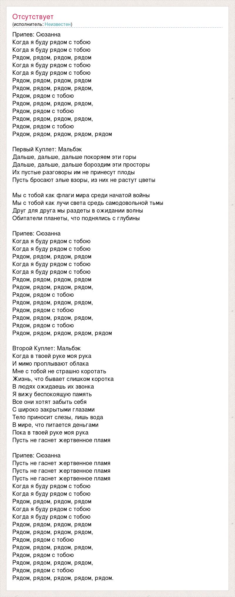 Припев: Сюзанна Когда я буду рядом с тобою Когда я буду рядом с тобою Рядом, рядом, рядом, рядом Когда я буду рядом с тобою Когда я буду рядом с тобою Рядом, рядом, рядом, рядом Рядом, рядом, рядом, рядом, Рядом, рядом с тобою Рядом, рядом, рядом, рядом, Рядом, рядом с тобою Рядом, рядом, рядом, рядом, Рядом, рядом с тобою Рядом, рядом, рядом, рядом, рядом Первый Куплет: Мальбэк Дальше, дальше, дальше покоряем эти горы Дальше, дальше, дальше бороздим эти просторы Их пустые разговоры им не принесут плоды Пусть бросают злые взоры, из них не растут цветы Мы с тобой как флаги мира среди начатой войны Мы с тобой как лучи света средь самодовольной тьмы Друг для друга мы раздеты в ожидании волны Обитатели планеты, что поднялись с глубины Припев: Сюзанна Когда я буду рядом с тобою Когда я буду рядом с тобою Рядом, рядом, рядом, рядом Когда я буду рядом с тобою Когда я буду рядом с тобою Рядом, рядом, рядом, рядом Рядом, рядом, рядом, рядом, Рядом, рядом с тобою Рядом, рядом, рядом, рядом, Рядом, рядом с тобою Рядом, рядом, рядом, рядом, Рядом, рядом с тобою Рядом, рядом, рядом, рядом, рядом Второй Куплет: Мальбэк Когда в твоей руке моя рука И мимо проплывают облака Мне с тобой не страшно коротать Жизнь, что бывает слишком коротка В людях ожидаешь их звонка Я вижу беспокоящую память Все они хотят забыть себя С широко закрытыми глазами Тело приносит слезы, лишь вода В мире, что питается деньгами Пока в твоей руке моя рука Пусть не гаснет жертвенное пламя Припев: Сюзанна Пусть не гаснет жертвенное пламя Пусть не гаснет жертвенное пламя Пусть не гаснет жертвенное пламя Когда я буду рядом с тобою Когда я буду рядом с тобою Рядом, рядом, рядом, рядом Когда я буду рядом с тобою Когда я буду рядом с тобою Рядом, рядом, рядом, рядом Рядом, рядом, рядом, рядом, Рядом, рядом с тобою Рядом, рядом, рядом, рядом, Рядом, рядом с тобою Рядом, рядом, рядом, рядом, Рядом, рядом с тобою Рядом, рядом, рядом, рядом, рядом.