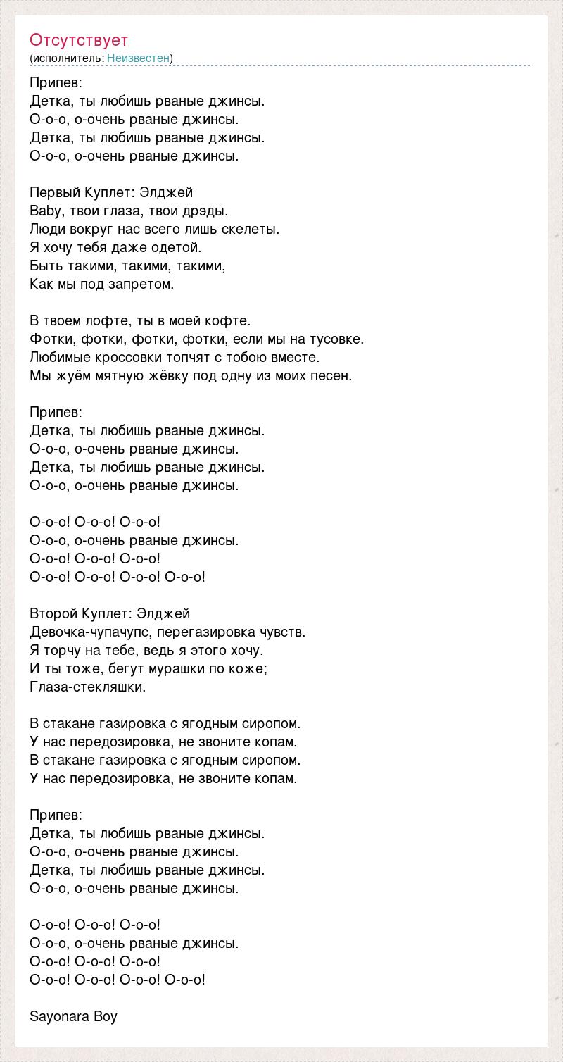 Припев: Детка, ты любишь рваные джинсы. О-о-о, о-очень рваные джинсы. Детка, ты любишь рваные джинсы. О-о-о, о-очень рваные джинсы. Первый Куплет: Элджей Baby, твои глаза, твои дрэды. Люди вокруг нас всего лишь скелеты. Я хочу тебя даже одетой. Быть такими, такими, такими, Как мы под запретом. В твоем лофте, ты в моей кофте. Фотки, фотки, фотки, фотки, если мы на тусовке. Любимые кроссовки топчят с тобою вместе. Мы жуём мятную жёвку под одну из моих песен. Припев: Детка, ты любишь рваные джинсы. О-о-о, о-очень рваные джинсы. Детка, ты любишь рваные джинсы. О-о-о, о-очень рваные джинсы. О-о-о! О-о-о! О-о-о! О-о-о, о-очень рваные джинсы. О-о-о! О-о-о! О-о-о! О-о-о! О-о-о! О-о-о! О-о-о! Второй Куплет: Элджей Девочка-чупачупс, перегазировка чувств. Я торчу на тебе, ведь я этого хочу. И ты тоже, бегут мурашки по коже; Глаза-стекляшки. В стакане газировка с ягодным сиропом. У нас передозировка, не звоните копам. В стакане газировка с ягодным сиропом. У нас передозировка, не звоните копам. Припев: Детка, ты любишь рваные джинсы. О-о-о, о-очень рваные джинсы. Детка, ты любишь рваные джинсы. О-о-о, о-очень рваные джинсы. О-о-о! О-о-о! О-о-о! О-о-о, о-очень рваные джинсы. О-о-о! О-о-о! О-о-о! О-о-о! О-о-о! О-о-о! О-о-о! Sayonara Boy