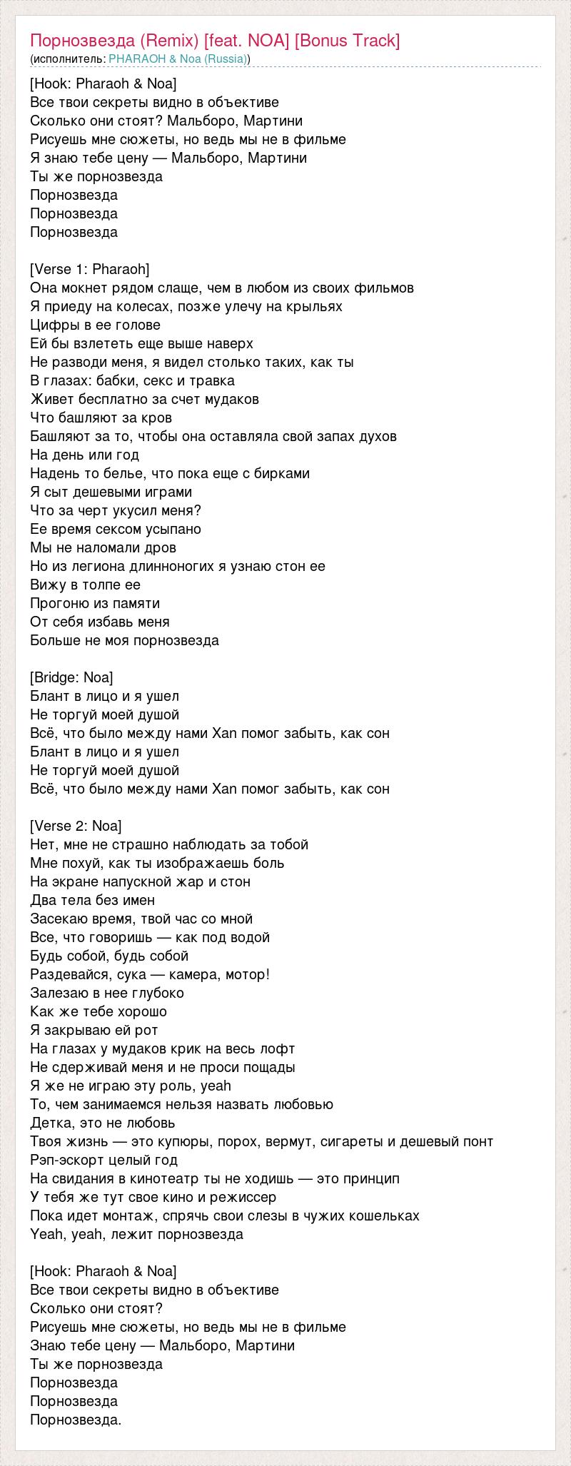 [Hook: Pharaoh & Noa] Все твои секреты видно в объективе Сколько они стоят? Мальборо, Мартини Рисуешь мне сюжеты, но ведь мы не в фильме Я знаю тебе цену — Мальборо, Мартини Ты же порнозвезда Порнозвезда Порнозвезда Порнозвезда [Verse 1: Pharaoh] Она мокнет рядом слаще, чем в любом из своих фильмов Я приеду на колесах, позже улечу на крыльях Цифры в ее голове Ей бы взлететь еще выше наверх Не разводи меня, я видел столько таких, как ты В глазах: бабки, секс и травка Живет бесплатно за счет мудаков Что башляют за кров Башляют за то, чтобы она оставляла свой запах духов На день или год Надень то белье, что пока еще с бирками Я сыт дешевыми играми Что за черт укусил меня? Ее время сексом усыпано Мы не наломали дров Но из легиона длинноногих я узнаю стон ее Вижу в толпе ее Прогоню из памяти От себя избавь меня Больше не моя порнозвезда [Bridge: Noa] Блант в лицо и я ушел Не торгуй моей душой Всё, что было между нами Xan помог забыть, как сон Блант в лицо и я ушел Не торгуй моей душой Всё, что было между нами Xan помог забыть, как сон [Verse 2: Noa] Нет, мне не страшно наблюдать за тобой Мне похуй, как ты изображаешь боль На экране напускной жар и стон Два тела без имен Засекаю время, твой час со мной Все, что говоришь — как под водой Будь собой, будь собой Раздевайся, сука — камера, мотор! Залезаю в нее глубоко Как же тебе хорошо Я закрываю ей рот На глазах у мудаков крик на весь лофт Не сдерживай меня и не проси пощады Я же не играю эту роль, yeah То, чем занимаемся нельзя назвать любовью Детка, это не любовь Твоя жизнь — это купюры, порох, вермут, сигареты и дешевый понт Рэп-эскорт целый год На свидания в кинотеатр ты не ходишь — это принцип У тебя же тут свое кино и режиссер Пока идет монтаж, спрячь свои слезы в чужих кошельках Yeah, yeah, лежит порнозвезда [Hook: Pharaoh & Noa] Все твои секреты видно в объективе Сколько они стоят? Рисуешь мне сюжеты, но ведь мы не в фильме Знаю тебе цену — Мальборо, Мартини Ты же порнозвезда Порнозвезда Порнозвезда Порнозвезда.