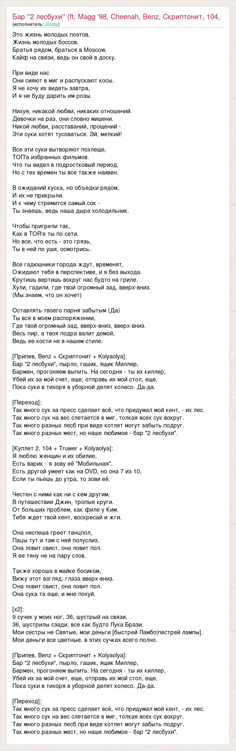 Это жизнь молодых поэтов, Жизнь молодых боссов. Братья рядом, браться в Moscow. Кайф на связи, ведь он свой в доску. При виде нас Они сияют в миг и распускают косы. Я не хочу их видеть завтра, И я не буду дарить им розы. Нихуя, никакой любви, никаких отношений. Девочки на раз, они словно мишени. Никой любви, расставаний, прощений - Эти суки хотят тусоваться. Эй, мелкий! Все эти суки вытворяют похлеще, ТОП'а избранных фильмов. Что ты видел в подростковый период, Но с тех времен ты все также наивен. В ожиданий куска, но объедки рядом, И их не прикрыли. И к чему стремится самый сок - Ты знаешь, ведь наша дыра холодильник. Чтобы пригрели так, Как в TOR'е ты по сети. Но все, что есть - это грязь, Ты в ней по уши, осмотрись. Все гадюшники города ждут, временят, Ожидают тебя в перспективе, и я без выхода. Крутишь вертишь вокруг нас будто на гриле. Хули, гадили, где твой огромный зад, вверх-вниз. (Мы знаем, что он хочет) Оставлять твоего парня забытым (Да) Ты вся в моем распоряжении, Где твой огромный зад, вверх-вниз, вверх-вниз. Весь пир, а твоя подра валит домой, Ведь ее кости не в нашем стиле. [Припев, Benz + Скриптонит + Kolyaolya]: Бар "2 лесбухи", пырло, гашик, ящик Миллер, Бармен, прогоняем выпить. На сегодня - ты их киллер, Убей их за мой счет, еще, отправь их мой стол, еще, Пока суки в тихоря в уборной делят колесо. Да-да. [Переход]: Так много сук за пресс сделает всё, что придумал мой кент, - их лес. Так много сук на вес слетается в миг, толкая всех сук вокруг. Так много разных лесб при виде котлет могут забыть подруг. Так много разных мест, но наше любимое - бар "2 лесбухи". [Куплет 2, 104 + Truwer + Kolyaolya]: Я люблю женщин и их обилие, Есть варик - я зову её "Мобильная". Есть другой умеет как на DVD, но она 7 из 10, Если ты пьешь до утра, то зови её. Честен с ними как ни с кем другим. В путешествии Джин, тропые круги. От больших проблем, как филе у Ким. Тебя ждет твой кент, воскресай и жги. Она неспеша греет танцпол, Пацы тут и там с ней полуслиз, Она ловит свист, она ловит пол. Я ее тяну не на пару слов. Также хороша в майке босиком, Вижу этот взгляд, глаза вверх-вниз. Она ловит свист, она ловит пол. Она сука та еще, и мне похуй. [х2]: 9 сучек у моих ног, 36, шустрый на связи, 36, шустрилы сзади, все как будто Лука Брази. Мои сестры не Святые, мои деньги [быстрей Ламбо|пестрей лампы]. Мои деньги все цветные, в этих сучках всего полно. [Припев, Benz + Скриптонит + Kolyaolya]: Бар "2 лесбухи", пырло, гашик, ящик Миллер, Бармен, прогоняем выпить. На сегодня - ты их киллер, Убей их за мой счет, еще, отправь их мой стол, еще, Пока суки в тихоря в уборной делят колесо. Да-да. [Переход]: Так много сук за пресс сделает всё, что придумал мой кент, - их лес. Так много сук на вес слетается в миг, толкая всех сук вокруг. Так много разных лесб при виде котлет могут забыть подруг. Так много разных мест, но наше любимое - бар "2 лесбухи".