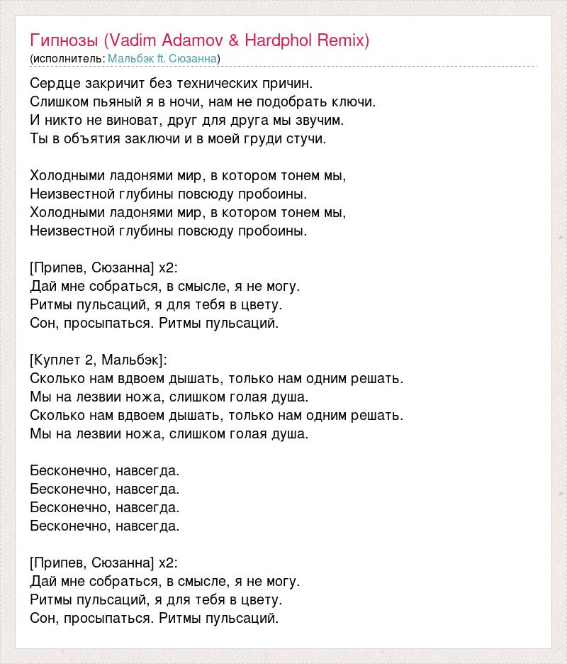 Сердце закричит без технических причин. Слишком пьяный я в ночи, нам не подобрать ключи. И никто не виноват, друг для друга мы звучим. Ты в объятия заключи и в моей груди стучи. Холодными ладонями мир, в котором тонем мы, Неизвестной глубины повсюду пробоины. Холодными ладонями мир, в котором тонем мы, Неизвестной глубины повсюду пробоины. [Припев, Сюзанна] х2: Дай мне собраться, в смысле, я не могу. Ритмы пульсаций, я для тебя в цвету. Сон, просыпаться. Ритмы пульсаций. [Куплет 2, Мальбэк]: Сколько нам вдвоем дышать, только нам одним решать. Мы на лезвии ножа, слишком голая душа. Сколько нам вдвоем дышать, только нам одним решать. Мы на лезвии ножа, слишком голая душа. Бесконечно, навсегда. Бесконечно, навсегда. Бесконечно, навсегда. Бесконечно, навсегда. [Припев, Сюзанна] х2: Дай мне собраться, в смысле, я не могу. Ритмы пульсаций, я для тебя в цвету. Сон, просыпаться. Ритмы пульсаций.