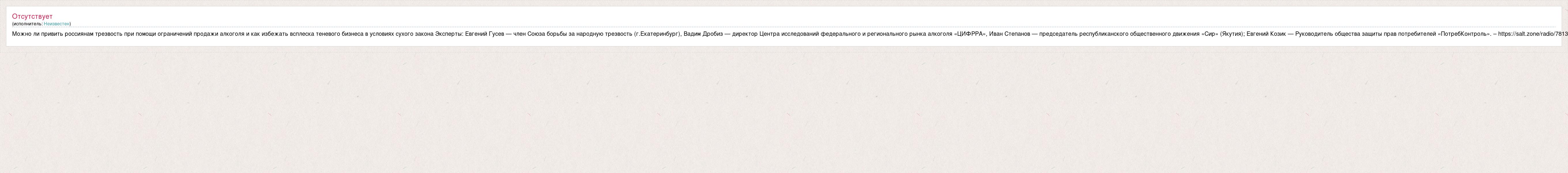 Можно ли привить россиянам трезвость при помощи ограничений продажи алкоголя и как избежать всплеска теневого бизнеса в условиях сухого закона Эксперты: Евгений Гусев — член Союза борьбы за народную трезвость (г.Екатеринбург), Вадим Дробиз — директор Центра исследований федерального и регионального рынка алкоголя «ЦИФРРА», Иван Степанов — председатель республиканского общественного движения «Сир» (Якутия); Евгений Козик — Руководитель общества защиты прав потребителей «ПотребКонтроль». – https://salt.zone/radio/7813