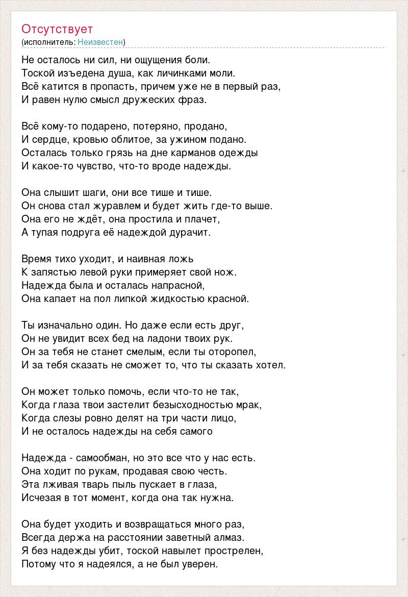 Не осталось ни сил, ни ощущения боли. Тоской изъедена душа, как личинками моли. Всё катится в пропасть, причем уже не в первый раз, И равен нулю смысл дружеских фраз. Всё кому-то подарено, потеряно, продано, И сердце, кровью облитое, за ужином подано. Осталась только грязь на дне карманов одежды И какое-то чувство, что-то вроде надежды. Она слышит шаги, они все тише и тише. Он снова стал журавлем и будет жить где-то выше. Она его не ждёт, она простила и плачет, А тупая подруга её надеждой дурачит. Время тихо уходит, и наивная ложь К запястью левой руки примеряет свой нож. Надежда была и осталась напрасной, Она капает на пол липкой жидкостью красной. Ты изначально один. Но даже если есть друг, Он не увидит всех бед на ладони твоих рук. Он за тебя не станет смелым, если ты оторопел, И за тебя сказать не сможет то, что ты сказать хотел. Он может только помочь, если что-то не так, Когда глаза твои застелит безысходностью мрак, Когда слезы ровно делят на три части лицо, И не осталось надежды на себя самого Надежда - самообман, но это все что у нас есть. Она ходит по рукам, продавая свою честь. Эта лживая тварь пыль пускает в глаза, Исчезая в тот момент, когда она так нужна. Она будет уходить и возвращаться много раз, Всегда держа на расстоянии заветный алмаз. Я без надежды убит, тоской навылет прострелен, Потому что я надеялся, а не был уверен.