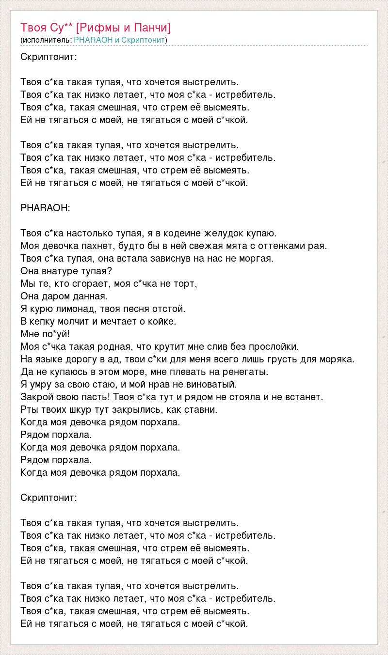 Скриптонит: Твоя с*ка такая тупая, что хочется выстрелить. Твоя с*ка так низко летает, что моя с*ка - истребитель. Твоя с*ка, такая смешная, что стрем её высмеять. Ей не тягаться с моей, не тягаться с моей с*чкой. Твоя с*ка такая тупая, что хочется выстрелить. Твоя с*ка так низко летает, что моя с*ка - истребитель. Твоя с*ка, такая смешная, что стрем её высмеять. Ей не тягаться с моей, не тягаться с моей с*чкой. PHARAOH: Твоя с*ка настолько тупая, я в кодеине желудок купаю. Моя девочка пахнет, будто бы в ней свежая мята с оттенками рая. Твоя с*ка тупая, она встала зависнув на нас не моргая. Она внатуре тупая? Мы те, кто сгорает, моя с*чка не торт, Она даром данная. Я курю лимонад, твоя песня отстой. В кепку молчит и мечтает о койке. Мне по*уй! Моя с*чка такая родная, что крутит мне слив без прослойки. На языке дорогу в ад, твои с*ки для меня всего лишь грусть для моряка. Да не купаюсь в этом море, мне плевать на ренегаты. Я умру за свою стаю, и мой нрав не виноватый. Закрой свою пасть! Твоя с*ка тут и рядом не стояла и не встанет. Рты твоих шкур тут закрылись, как ставни. Когда моя девочка рядом порхала. Рядом порхала. Когда моя девочка рядом порхала. Рядом порхала. Когда моя девочка рядом порхала. Скриптонит: Твоя с*ка такая тупая, что хочется выстрелить. Твоя с*ка так низко летает, что моя с*ка - истребитель. Твоя с*ка, такая смешная, что стрем её высмеять. Ей не тягаться с моей, не тягаться с моей с*чкой. Твоя с*ка такая тупая, что хочется выстрелить. Твоя с*ка так низко летает, что моя с*ка - истребитель. Твоя с*ка, такая смешная, что стрем её высмеять. Ей не тягаться с моей, не тягаться с моей с*чкой.