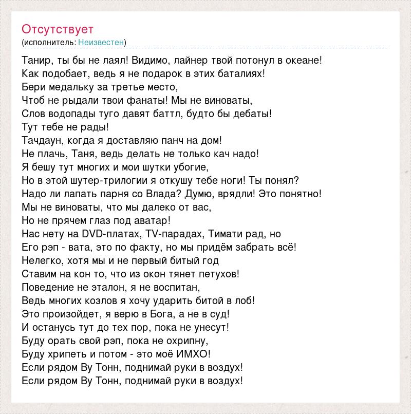 Танир, ты бы не лаял! Видимо, лайнер твой потонул в океане! Как подобает, ведь я не подарок в этих баталиях! Бери медальку за третье место, Чтоб не рыдали твои фанаты! Мы не виноваты, Слов водопады туго давят баттл, будто бы дебаты! Тут тебе не рады! Тачдаун, когда я доставляю панч на дом! Не плачь, Таня, ведь делать не только кач надо! Я бешу тут многих и мои шутки убогие, Но в этой шутер-трилогии я откушу тебе ноги! Ты понял? Надо ли лапать парня со Влада? Думю, врядли! Это понятно! Мы не виноваты, что мы далеко от вас, Но не прячем глаз под аватар! Нас нету на DVD-платах, TV-парадах, Тимати рад, но Его рэп - вата, это по факту, но мы придём забрать всё! Нелегко, хотя мы и не первый битый год Ставим на кон то, что из окон тянет петухов! Поведение не эталон, я не воспитан, Ведь многих козлов я хочу ударить битой в лоб! Это произойдет, я верю в Бога, а не в суд! И останусь тут до тех пор, пока не унесут! Буду орать свой рэп, пока не охрипну, Буду хрипеть и потом - это моё ИМХО! Если рядом Ву Тонн, поднимай руки в воздух! Если рядом Ву Тонн, поднимай руки в воздух!