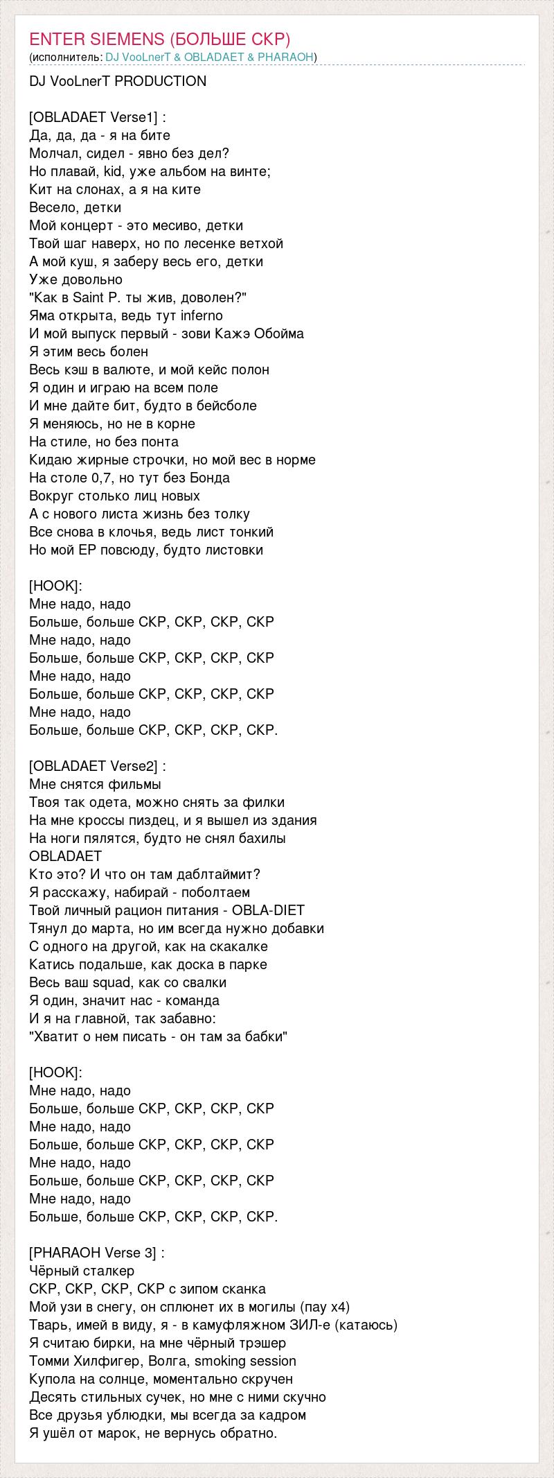 DJ VooLnerT PRODUCTION [OBLADAET Verse1] : Да, да, да - я на бите Молчал, сидел - явно без дел? Но плавай, kid, уже альбом на винте; Кит на слонах, а я на ките Весело, детки Мой концерт - это месиво, детки Твой шаг наверх, но по лесенке ветхой А мой куш, я заберу весь его, детки Уже довольно "Как в Saint P. ты жив, доволен?" Яма открыта, ведь тут inferno И мой выпуск первый - зови Кажэ Обойма Я этим весь болен Весь кэш в валюте, и мой кейс полон Я один и играю на всем поле И мне дайте бит, будто в бейсболе Я меняюсь, но не в корне На стиле, но без понта Кидаю жирные строчки, но мой вес в норме На столе 0,7, но тут без Бонда Вокруг столько лиц новых А с нового листа жизнь без толку Все снова в клочья, ведь лист тонкий Но мой EP повсюду, будто листовки [HOOK]: Мне надо, надо Больше, больше СКР, СКР, СКР, СКР Мне надо, надо Больше, больше СКР, СКР, СКР, СКР Мне надо, надо Больше, больше СКР, СКР, СКР, СКР Мне надо, надо Больше, больше СКР, СКР, СКР, СКР. [OBLADAET Verse2] : Мне снятся фильмы Твоя так одета, можно снять за филки На мне кроссы пиздец, и я вышел из здания На ноги пялятся, будто не снял бахилы OBLADAET Кто это? И что он там даблтаймит? Я расскажу, набирай - поболтаем Твой личный рацион питания - OBLA-DIET Тянул до марта, но им всегда нужно добавки С одного на другой, как на скакалке Катись подальше, как доска в парке Весь ваш squad, как со свалки Я один, значит нас - команда И я на главной, так забавно: "Хватит о нем писать - он там за бабки" [HOOK]: Мне надо, надо Больше, больше СКР, СКР, СКР, СКР Мне надо, надо Больше, больше СКР, СКР, СКР, СКР Мне надо, надо Больше, больше СКР, СКР, СКР, СКР Мне надо, надо Больше, больше СКР, СКР, СКР, СКР. [PHARAOH Verse 3] : Чёрный сталкер СКР, СКР, СКР, СКР с зипом сканка Мой узи в снегу, он сплюнет их в могилы (пау х4) Тварь, имей в виду, я - в камуфляжном ЗИЛ-е (катаюсь) Я считаю бирки, на мне чёрный трэшер Томми Хилфигер, Волга, smoking session Купола на солнце, моментально скручен Десять стильных сучек, но мне с ними скучно Все друзья ублюдки, мы всегда за кадром Я ушёл от марок, не вернусь обратно.