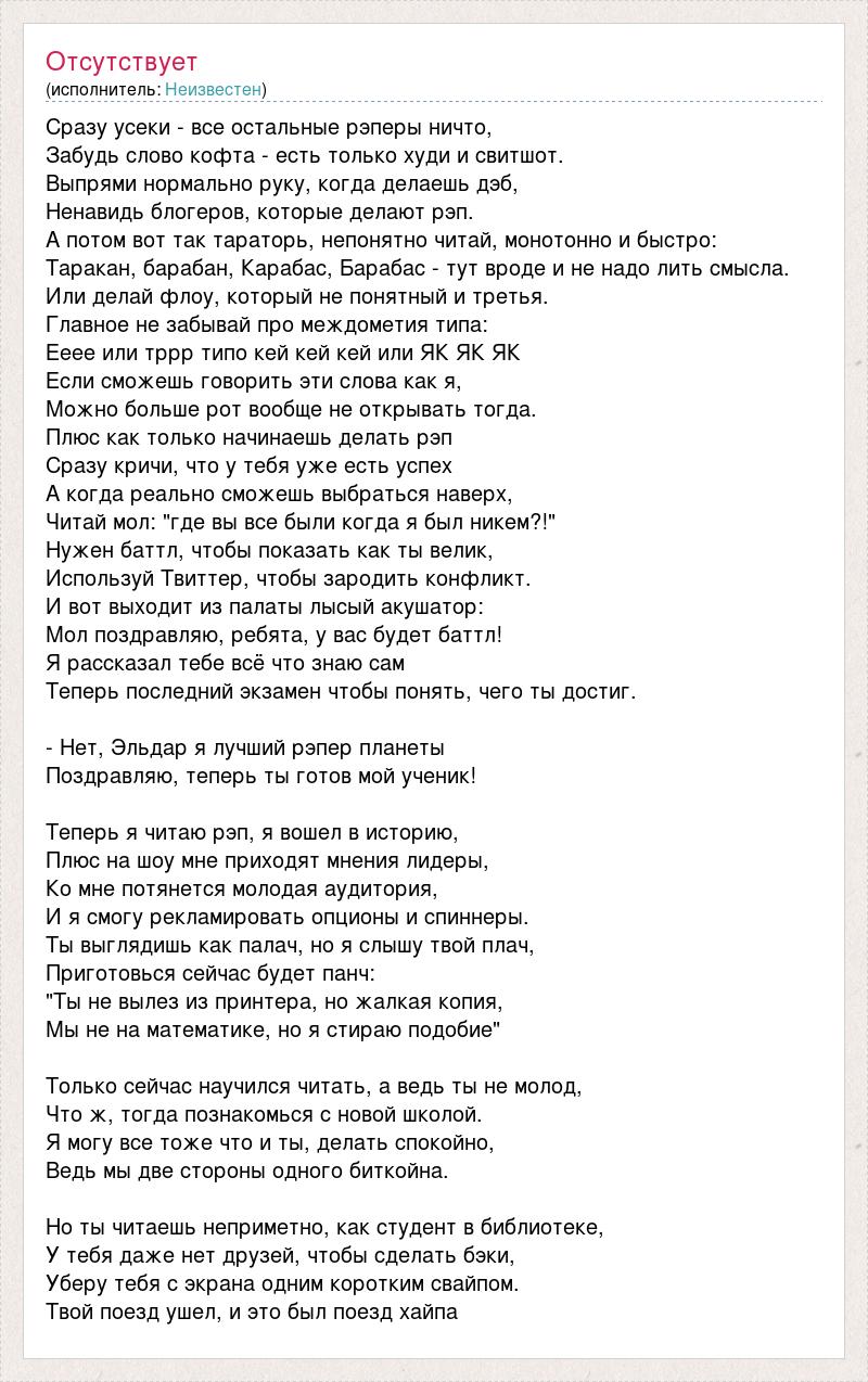 Сразу усеки - все остальные рэперы ничто, Забудь слово кофта - есть только худи и свитшот. Выпрями нормально руку, когда делаешь дэб, Ненавидь блогеров, которые делают рэп. А потом вот так тараторь, непонятно читай, монотонно и быстро: Таракан, барабан, Карабас, Барабас - тут вроде и не надо лить смысла. Или делай флоу, который не понятный и третья. Главное не забывай про междометия типа: Ееее или тррр типо кей кей кей или ЯК ЯК ЯК Если сможешь говорить эти слова как я, Можно больше рот вообще не открывать тогда. Плюс как только начинаешь делать рэп Сразу кричи, что у тебя уже есть успех А когда реально сможешь выбраться наверх, Читай мол: "где вы все были когда я был никем?!" Нужен баттл, чтобы показать как ты велик, Используй Твиттер, чтобы зародить конфликт. И вот выходит из палаты лысый акушатор: Мол поздравляю, ребята, у вас будет баттл! Я рассказал тебе всё что знаю сам Теперь последний экзамен чтобы понять, чего ты достиг. - Нет, Эльдар я лучший рэпер планеты Поздравляю, теперь ты готов мой ученик! Теперь я читаю рэп, я вошел в историю, Плюс на шоу мне приходят мнения лидеры, Ко мне потянется молодая аудитория, И я смогу рекламировать опционы и спиннеры. Ты выглядишь как палач, но я слышу твой плач, Приготовься сейчас будет панч: "Ты не вылез из принтера, но жалкая копия, Мы не на математике, но я стираю подобие" Только сейчас научился читать, а ведь ты не молод, Что ж, тогда познакомься с новой школой. Я могу все тоже что и ты, делать спокойно, Ведь мы две стороны одного биткойна. Но ты читаешь неприметно, как студент в библиотеке, У тебя даже нет друзей, чтобы сделать бэки, Уберу тебя с экрана одним коротким свайпом. Твой поезд ушел, и это был поезд хайпа