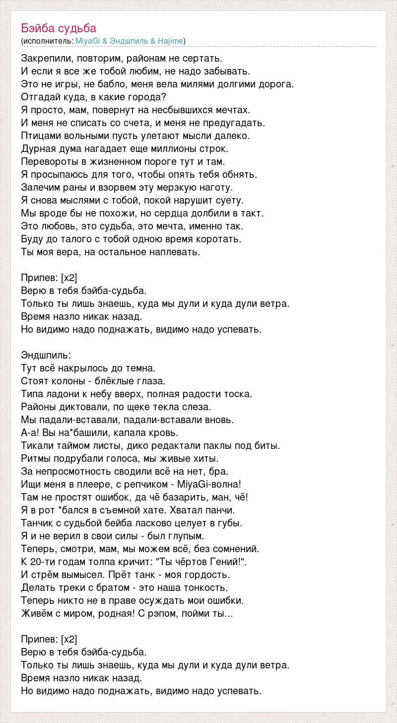 Закрепили, повторим, районам не сертать. И если я все же тобой любим, не надо забывать. Это не игры, не бабло, меня вела милями долгими дорога. Отгадай куда, в какие города? Я просто, мам, повернут на несбывшихся мечтах. И меня не списать со счета, и меня не предугадать. Птицами вольными пусть улетают мысли далеко. Дурная дума нагадает еще миллионы строк. Перевороты в жизненном пороге тут и там. Я просыпаюсь для того, чтобы опять тебя обнять. Залечим раны и взорвем эту мерзкую наготу. Я снова мыслями с тобой, покой нарушит суету. Мы вроде бы не похожи, но сердца долбили в такт. Это любовь, это судьба, это мечта, именно так. Буду до талого с тобой одною время коротать. Ты моя вера, на остальное наплевать. Припев: [x2] Верю в тебя бэйба-судьба. Только ты лишь знаешь, куда мы дули и куда дули ветра. Время назло никак назад. Но видимо надо поднажать, видимо надо успевать. Эндшпиль: Тут всё накрылось до темна. Стоят колоны - блёклые глаза. Типа ладони к небу вверх, полная радости тоска. Районы диктовали, по щеке текла слеза. Мы падали-вставали, падали-вставали вновь. А-а! Вы на*башили, капала кровь. Тикали таймом листы, дико редактали паклы под биты. Ритмы подрубали голоса, мы живые хиты. За непросмотность сводили всё на нет, бра. Ищи меня в плеере, с репчиком - MiyaGi-волна! Там не простят ошибок, да чё базарить, ман, чё! Я в рот *бался в съемной хате. Хватал панчи. Танчик с судьбой бейба ласково целует в губы. Я и не верил в свои силы - был глупым. Теперь, смотри, мам, мы можем всё, без сомнений. К 20-ти годам толпа кричит: "Ты чёртов Гений!". И стрём вымысел. Прёт танк - моя гордость. Делать треки с братом - это наша тонкость. Теперь никто не в праве осуждать мои ошибки. Живём с миром, родная! С рэпом, пойми ты... Припев: [x2] Верю в тебя бэйба-судьба. Только ты лишь знаешь, куда мы дули и куда дули ветра. Время назло никак назад. Но видимо надо поднажать, видимо надо успевать.