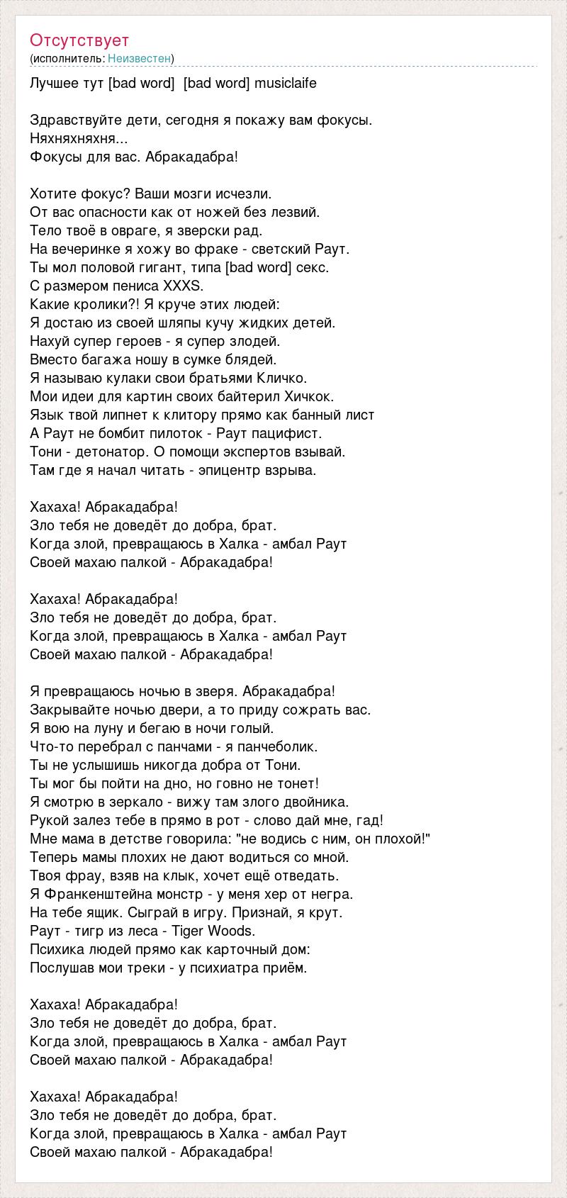 Лучшее тут [bad word] [bad word] musiclaife Здравствуйте дети, сегодня я покажу вам фокусы. Няхняхняхня... Фокусы для вас. Абракадабра! Хотите фокус? Ваши мозги исчезли. От вас опасности как от ножей без лезвий. Тело твоё в овраге, я зверски рад. На вечеринке я хожу во фраке - светский Раут. Ты мол половой гигант, типа [bad word] секс. С размером пениса XXXS. Какие кролики?! Я круче этих людей: Я достаю из своей шляпы кучу жидких детей. Нахуй супер героев - я супер злодей. Вместо багажа ношу в сумке блядей. Я называю кулаки свои братьями Кличко. Мои идеи для картин своих байтерил Хичкок. Язык твой липнет к клитору прямо как банный лист А Раут не бомбит пилоток - Раут пацифист. Тони - детонатор. О помощи экспертов взывай. Там где я начал читать - эпицентр взрыва. Хахаха! Абракадабра! Зло тебя не доведёт до добра, брат. Когда злой, превращаюсь в Халка - амбал Раут Своей махаю палкой - Абракадабра! Хахаха! Абракадабра! Зло тебя не доведёт до добра, брат. Когда злой, превращаюсь в Халка - амбал Раут Своей махаю палкой - Абракадабра! Я превращаюсь ночью в зверя. Абракадабра! Закрывайте ночью двери, а то приду сожрать вас. Я вою на луну и бегаю в ночи голый. Что-то перебрал с панчами - я панчеболик. Ты не услышишь никогда добра от Тони. Ты мог бы пойти на дно, но говно не тонет! Я смотрю в зеркало - вижу там злого двойника. Рукой залез тебе в прямо в рот - слово дай мне, гад! Мне мама в детстве говорила: "не водись с ним, он плохой!" Теперь мамы плохих не дают водиться со мной. Твоя фрау, взяв на клык, хочет ещё отведать. Я Франкенштейна монстр - у меня хер от негра. На тебе ящик. Сыграй в игру. Признай, я крут. Раут - тигр из леса - Tiger Woods. Психика людей прямо как карточный дом: Послушав мои треки - у психиатра приём. Хахаха! Абракадабра! Зло тебя не доведёт до добра, брат. Когда злой, превращаюсь в Халка - амбал Раут Своей махаю палкой - Абракадабра! Хахаха! Абракадабра! Зло тебя не доведёт до добра, брат. Когда злой, превращаюсь в Халка - амбал Раут Своей махаю палкой - Абракадабра!