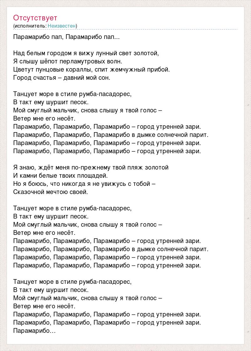 Парамарибо пап, Парамарибо пап... Над белым городом я вижу лунный свет золотой, Я слышу шёпот перламутровых волн. Цветут пунцовые кораллы, спит жемчужный прибой. Город счастья – давний мой сон. Танцует море в стиле румба-пасадорес, В такт ему шуршит песок. Мой смуглый мальчик, снова слышу я твой голос – Ветер мне его несёт. Парамарибо, Парамарибо, Парамарибо – город утренней зари. Парамарибо, Парамарибо, Парамарибо в дымке солнечной парит. Парамарибо, Парамарибо, Парамарибо – город утренней зари. Парамарибо, Парамарибо, Парамарибо – город утренней зари. Я знаю, ждёт меня по-прежнему твой пляж золотой И камни белые твоих площадей. Но я боюсь, что никогда я не увижусь с тобой – Сказочной мечтою своей. Танцует море в стиле румба-пасадорес, В такт ему шуршит песок. Мой смуглый мальчик, снова слышу я твой голос – Ветер мне его несёт. Парамарибо, Парамарибо, Парамарибо – город утренней зари. Парамарибо, Парамарибо, Парамарибо в дымке солнечной парит. Парамарибо, Парамарибо, Парамарибо – город утренней зари. Парамарибо, Парамарибо, Парамарибо – город утренней зари. Танцует море в стиле румба-пасадорес, В такт ему шуршит песок. Мой смуглый мальчик, снова слышу я твой голос – Ветер мне его несёт. Парамарибо, Парамарибо, Парамарибо – город утренней зари. Парамарибо, Парамарибо, Парамарибо – город утренней зари. Парамарибо…