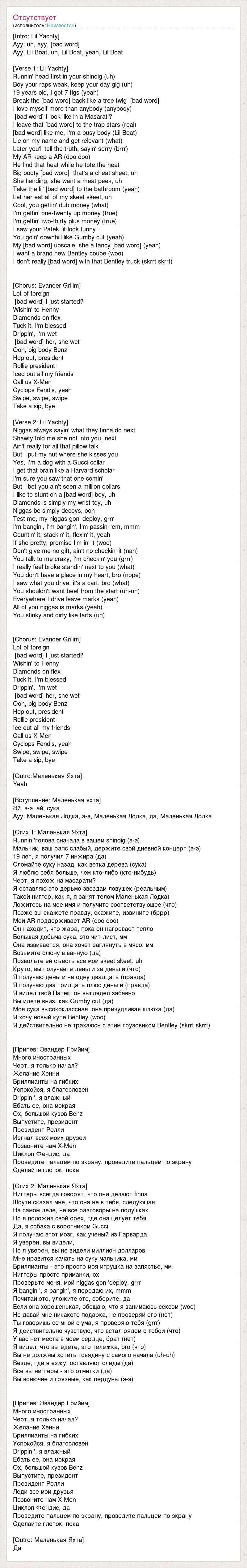 [Intro: Lil Yachty] Ayy, uh, ayy, [bad word] Ayy, Lil Boat, uh, Lil Boat, yeah, Lil Boat [Verse 1: Lil Yachty] Runnin' head first in your shindig (uh) Boy your raps weak, keep your day gig (uh) 19 years old, I got 7 figs (yeah) Break the [bad word] back like a tree twig [bad word] I love myself more than anybody (anybody) [bad word] I look like in a Masarati? I leave that [bad word] to the trap stars (real) [bad word] like me, I'm a busy body (Lil Boat) Lie on my name and get relevant (what) Later you'll tell the truth, sayin' sorry (brrr) My AR keep a AR (doo doo) He find that heat while he tote the heat Big booty [bad word] that's a cheat sheet, uh She fiending, she want a meat peek, uh Take the lil' [bad word] to the bathroom (yeah) Let her eat all of my skeet skeet, uh Cool, you gettin' dub money (what) I'm gettin' one-twenty up money (true) I'm gettin' two-thirty plus money (true) I saw your Patek, it look funny You goin' downhill like Gumby cut (yeah) My [bad word] upscale, she a fancy [bad word] (yeah) I want a brand new Bentley coupe (woo) I don't really [bad word] with that Bentley truck (skrrt skrrt) [Chorus: Evander Griiim] Lot of foreign [bad word] I just started? Wishin' to Henny Diamonds on flex Tuck it, I'm blessed Drippin', I'm wet [bad word] her, she wet Ooh, big body Benz Hop out, president Rollie president Iced out all my friends Call us X-Men Cyclops Fendis, yeah Swipe, swipe, swipe Take a sip, bye [Verse 2: Lil Yachty] Niggas always sayin' what they finna do next Shawty told me she not into you, next Ain't really for all that pillow talk But I put my nut where she kisses you Yes, I'm a dog with a Gucci collar I get that brain like a Harvard scholar I'm sure you saw that one comin' But I bet you ain't seen a million dollars I like to stunt on a [bad word] boy, uh Diamonds is simply my wrist toy, uh Niggas be simply decoys, ooh Test me, my niggas gon' deploy, grrr I'm bangin', I'm bangin', I'm passin' 'em, mmm Countin' it, stackin' it, flexin' it, yeah If she pretty, promise I'm in' it (woo) Don't give me no gift, ain't no checkin' it (nah) You talk to me crazy, I'm checkin' you (grrr) I really feel broke standin' next to you (what) You don't have a place in my heart, bro (nope) I saw what you drive, it's a cart, bro (what) You shouldn't want beef from the start (uh-uh) Everywhere I drive leave marks (yeah) All of you niggas is marks (yeah) You stinky and dirty like farts (uh) [Chorus: Evander Griiim] Lot of foreign [bad word] I just started? Wishin' to Henny Diamonds on flex Tuck it, I'm blessed Drippin', I'm wet [bad word] her, she wet Ooh, big body Benz Hop out, president Rollie president Ice out all my friends Call us X-Men Cyclops Fendis, yeah Swipe, swipe, swipe Take a sip, bye [Outro:Маленькая Яхта] Yeah [Вступление: Маленькая яхта] Эй, э-э, ай, сука Ayy, Маленькая Лодка, э-э, Маленькая Лодка, да, Маленькая Лодка [Стих 1: Маленькая Яхта] Runnin 'голова сначала в вашем shindig (э-э) Мальчик, ваш рапс слабый, держите свой дневной концерт (э-э) 19 лет, я получил 7 инжира (да) Сломайте суку назад, как ветка дерева (сука) Я люблю себя больше, чем кто-либо (кто-нибудь) Черт, я похож на масарати? Я оставляю это дерьмо звездам ловушек (реальным) Такой ниггер, как я, я занят телом Маленькая Лодка) Ложитесь на мое имя и получите соответствующее (что) Позже вы скажете правду, скажите, извините (бррр) Мой AR поддерживает AR (doo doo) Он находит, что жара, пока он нагревает тепло Большая добыча сука, это чит-лист, мм Она извивается, она хочет заглянуть в мясо, мм Возьмите слюну в ванную (да) Позвольте ей съесть все мои skeet skeet, uh Круто, вы получаете деньги за деньги (что) Я получаю деньги на одну двадцать (правда) Я получаю два тридцать плюс деньги (правда) Я видел твой Патек, он выглядел забавно Вы идете вниз, как Gumby cut (да) Моя сука высококлассная, она причудливая шлюха (да) Я хочу новый купе Bentley (woo) Я действительно не трахаюсь с этим грузовиком Bentley (skrrt skrrt) [Припев: Эвандер Грийим] Много иностранных Черт, я только начал? Желание Хенни Бриллианты на гибких Успокойся, я благословен Drippin ', я влажный Ебать ее, она мокрая Ох, большой кузов Benz Выпустите, президент Президент Ролли Изгнал всех моих друзей Позвоните нам X-Men Циклоп Фендис, да Проведите пальцем по экрану, проведите пальцем по экрану Сделайте глоток, пока [Стих 2: Маленькая Яхта] Ниггеры всегда говорят, что они делают finna Шоути сказал мне, что она не в тебя, следующая На самом деле, не все разговоры на подушках Но я положил свой орех, где она целует тебя Да, я собака с воротником Gucci Я получаю этот мозг, как ученый из Гарварда Я уверен, вы видел