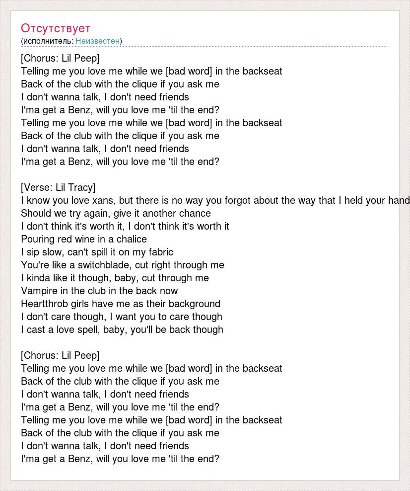 [Chorus: Lil Peep] Telling me you love me while we [bad word] in the backseat Back of the club with the clique if you ask me I don't wanna talk, I don't need friends I'ma get a Benz, will you love me 'til the end? Telling me you love me while we [bad word] in the backseat Back of the club with the clique if you ask me I don't wanna talk, I don't need friends I'ma get a Benz, will you love me 'til the end? [Verse: Lil Tracy] I know you love xans, but there is no way you forgot about the way that I held your hand Should we try again, give it another chance I don't think it's worth it, I don't think it's worth it Pouring red wine in a chalice I sip slow, can't spill it on my fabric You're like a switchblade, cut right through me I kinda like it though, baby, cut through me Vampire in the club in the back now Heartthrob girls have me as their background I don't care though, I want you to care though I cast a love spell, baby, you'll be back though [Chorus: Lil Peep] Telling me you love me while we [bad word] in the backseat Back of the club with the clique if you ask me I don't wanna talk, I don't need friends I'ma get a Benz, will you love me 'til the end? Telling me you love me while we [bad word] in the backseat Back of the club with the clique if you ask me I don't wanna talk, I don't need friends I'ma get a Benz, will you love me 'til the end?