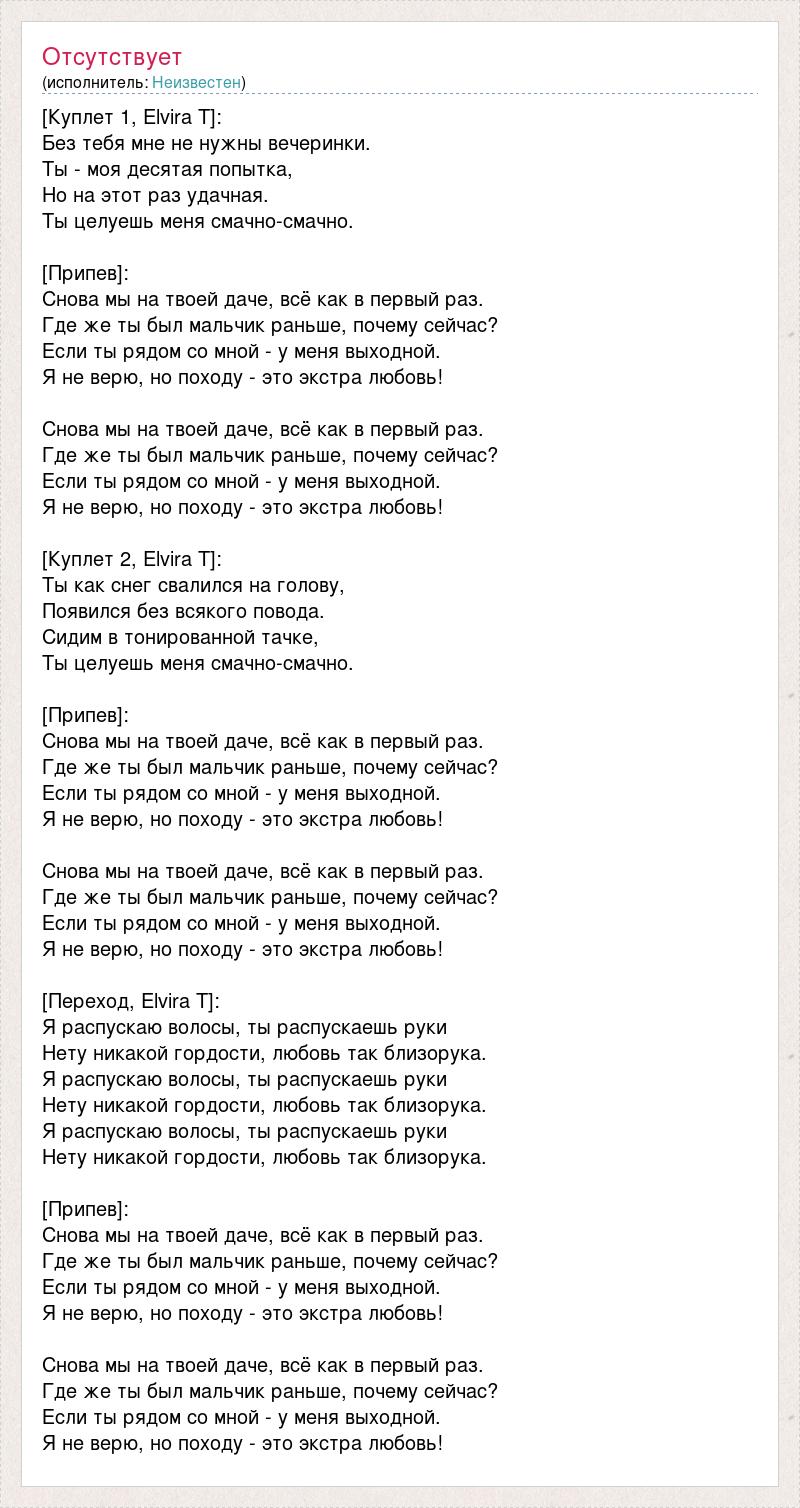 [Куплет 1, Elvira T]: Без тебя мне не нужны вечеринки. Ты - моя десятая попытка, Но на этот раз удачная. Ты целуешь меня смачно-смачно. [Припев]: Снова мы на твоей даче, всё как в первый раз. Где же ты был мальчик раньше, почему сейчас? Если ты рядом со мной - у меня выходной. Я не верю, но походу - это экстра любовь! Снова мы на твоей даче, всё как в первый раз. Где же ты был мальчик раньше, почему сейчас? Если ты рядом со мной - у меня выходной. Я не верю, но походу - это экстра любовь! [Куплет 2, Elvira T]: Ты как снег свалился на голову, Появился без всякого повода. Сидим в тонированной тачке, Ты целуешь меня смачно-смачно. [Припев]: Снова мы на твоей даче, всё как в первый раз. Где же ты был мальчик раньше, почему сейчас? Если ты рядом со мной - у меня выходной. Я не верю, но походу - это экстра любовь! Снова мы на твоей даче, всё как в первый раз. Где же ты был мальчик раньше, почему сейчас? Если ты рядом со мной - у меня выходной. Я не верю, но походу - это экстра любовь! [Переход, Elvira T]: Я распускаю волосы, ты распускаешь руки Нету никакой гордости, любовь так близорука. Я распускаю волосы, ты распускаешь руки Нету никакой гордости, любовь так близорука. Я распускаю волосы, ты распускаешь руки Нету никакой гордости, любовь так близорука. [Припев]: Снова мы на твоей даче, всё как в первый раз. Где же ты был мальчик раньше, почему сейчас? Если ты рядом со мной - у меня выходной. Я не верю, но походу - это экстра любовь! Снова мы на твоей даче, всё как в первый раз. Где же ты был мальчик раньше, почему сейчас? Если ты рядом со мной - у меня выходной. Я не верю, но походу - это экстра любовь!
