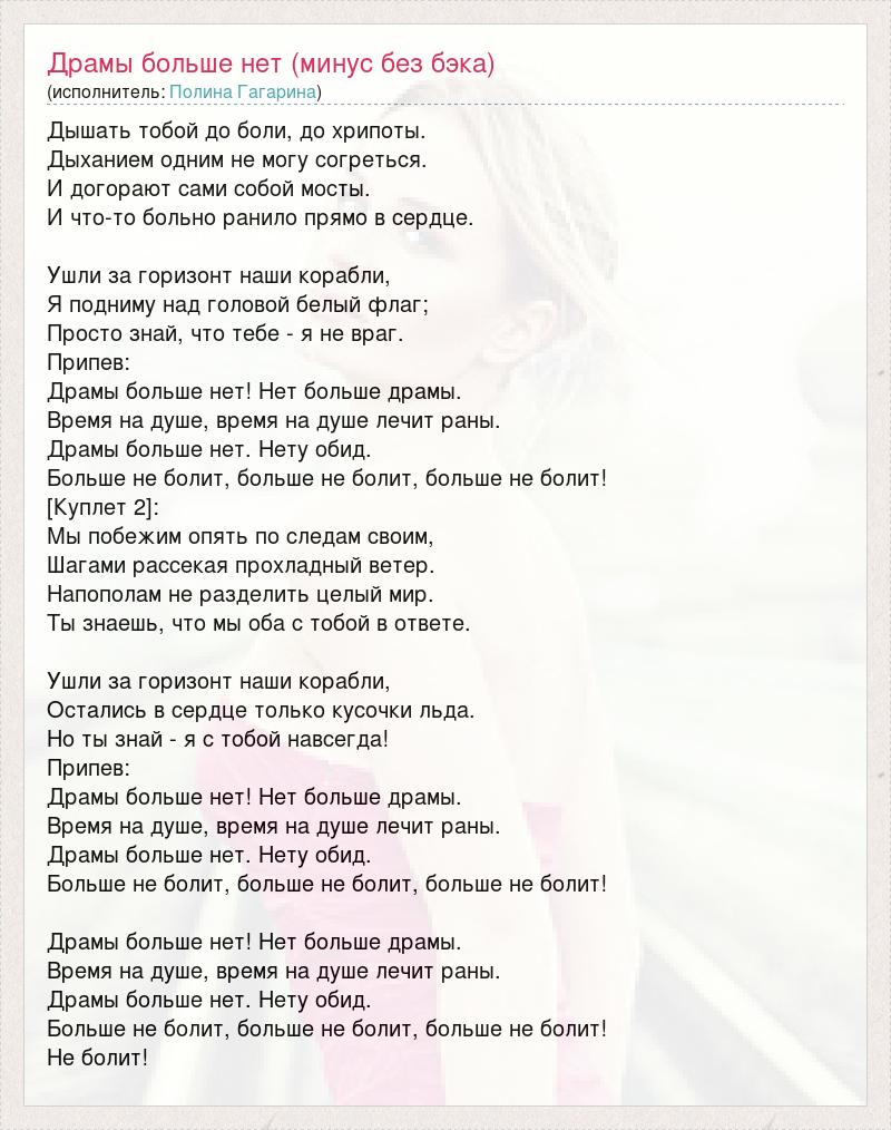 Дышать тобой до боли, до хрипоты. Дыханием одним не могу согреться. И догорают сами собой мосты. И что-то больно ранило прямо в сердце. Ушли за горизонт наши корабли, Я подниму над головой белый флаг; Просто знай, что тебе - я не враг. Припев: Драмы больше нет! Нет больше драмы. Время на душе, время на душе лечит раны. Драмы больше нет. Нету обид. Больше не болит, больше не болит, больше не болит! [Куплет 2]: Мы побежим опять по следам своим, Шагами рассекая прохладный ветер. Напополам не разделить целый мир. Ты знаешь, что мы оба с тобой в ответе. Ушли за горизонт наши корабли, Остались в сердце только кусочки льда. Но ты знай - я с тобой навсегда! Припев: Драмы больше нет! Нет больше драмы. Время на душе, время на душе лечит раны. Драмы больше нет. Нету обид. Больше не болит, больше не болит, больше не болит! Драмы больше нет! Нет больше драмы. Время на душе, время на душе лечит раны. Драмы больше нет. Нету обид. Больше не болит, больше не болит, больше не болит! Не болит!