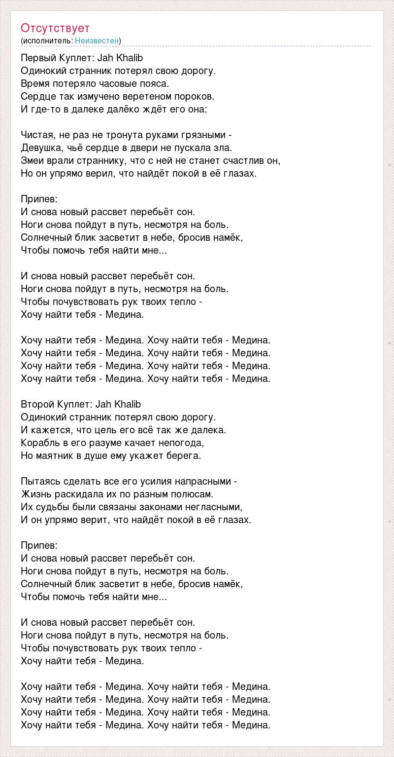 Первый Куплет: Jah Khalib Одинокий странник потерял свою дорогу. Время потеряло часовые пояса. Сердце так измучено веретеном пороков. И где-то в далеке далёко ждёт его она: Чистая, не раз не тронута руками грязными - Девушка, чьё сердце в двери не пускала зла. Змеи врали страннику, что с ней не станет счастлив он, Но он упрямо верил, что найдёт покой в её глазах. Припев: И снова новый рассвет перебьёт сон. Ноги снова пойдут в путь, несмотря на боль. Солнечный блик засветит в небе, бросив намёк, Чтобы помочь тебя найти мне... И снова новый рассвет перебьёт сон. Ноги снова пойдут в путь, несмотря на боль. Чтобы почувствовать рук твоих тепло - Хочу найти тебя - Медина. Хочу найти тебя - Медина. Хочу найти тебя - Медина. Хочу найти тебя - Медина. Хочу найти тебя - Медина. Хочу найти тебя - Медина. Хочу найти тебя - Медина. Хочу найти тебя - Медина. Хочу найти тебя - Медина. Второй Куплет: Jah Khalib Одинокий странник потерял свою дорогу. И кажется, что цель его всё так же далека. Корабль в его разуме качает непогода, Но маятник в душе ему укажет берега. Пытаясь сделать все его усилия напрасными - Жизнь раскидала их по разным полюсам. Их судьбы были связаны законами негласными, И он упрямо верит, что найдёт покой в её глазах. Припев: И снова новый рассвет перебьёт сон. Ноги снова пойдут в путь, несмотря на боль. Солнечный блик засветит в небе, бросив намёк, Чтобы помочь тебя найти мне... И снова новый рассвет перебьёт сон. Ноги снова пойдут в путь, несмотря на боль. Чтобы почувствовать рук твоих тепло - Хочу найти тебя - Медина. Хочу найти тебя - Медина. Хочу найти тебя - Медина. Хочу найти тебя - Медина. Хочу найти тебя - Медина. Хочу найти тебя - Медина. Хочу найти тебя - Медина. Хочу найти тебя - Медина. Хочу найти тебя - Медина.