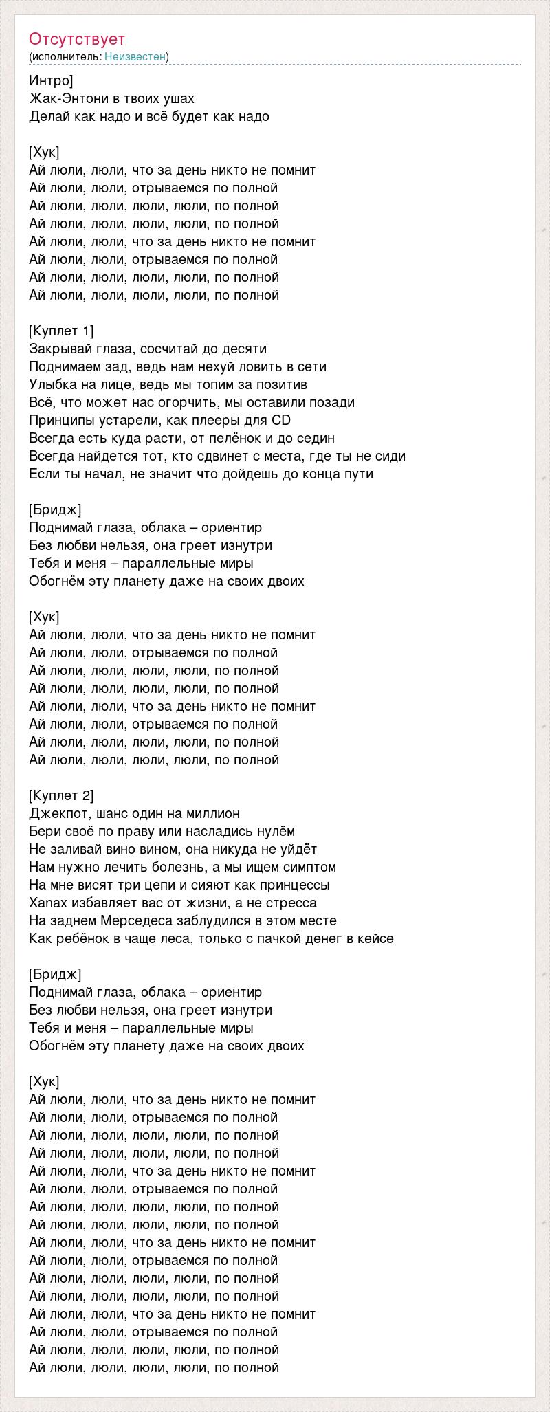 Интро] Жак-Энтони в твоих ушах Делай как надо и всё будет как надо [Хук] Ай люли, люли, что за день никто не помнит Ай люли, люли, отрываемся по полной Ай люли, люли, люли, люли, по полной Ай люли, люли, люли, люли, по полной Ай люли, люли, что за день никто не помнит Ай люли, люли, отрываемся по полной Ай люли, люли, люли, люли, по полной Ай люли, люли, люли, люли, по полной [Куплет 1] Закрывай глаза, сосчитай до десяти Поднимаем зад, ведь нам нехуй ловить в сети Улыбка на лице, ведь мы топим за позитив Всё, что может нас огорчить, мы оставили позади Принципы устарели, как плееры для CD Всегда есть куда расти, от пелёнок и до седин Всегда найдется тот, кто сдвинет с места, где ты не сиди Если ты начал, не значит что дойдешь до конца пути [Бридж] Поднимай глаза, облака – ориентир Без любви нельзя, она греет изнутри Тебя и меня – параллельные миры Обогнём эту планету даже на своих двоих [Хук] Ай люли, люли, что за день никто не помнит Ай люли, люли, отрываемся по полной Ай люли, люли, люли, люли, по полной Ай люли, люли, люли, люли, по полной Ай люли, люли, что за день никто не помнит Ай люли, люли, отрываемся по полной Ай люли, люли, люли, люли, по полной Ай люли, люли, люли, люли, по полной [Куплет 2] Джекпот, шанс один на миллион Бери своё по праву или насладись нулём Не заливай вино вином, она никуда не уйдёт Нам нужно лечить болезнь, а мы ищем симптом На мне висят три цепи и сияют как принцессы Xanax избавляет вас от жизни, а не стресса На заднем Мерседеса заблудился в этом месте Как ребёнок в чаще леса, только с пачкой денег в кейсе [Бридж] Поднимай глаза, облака – ориентир Без любви нельзя, она греет изнутри Тебя и меня – параллельные миры Обогнём эту планету даже на своих двоих [Хук] Ай люли, люли, что за день никто не помнит Ай люли, люли, отрываемся по полной Ай люли, люли, люли, люли, по полной Ай люли, люли, люли, люли, по полной Ай люли, люли, что за день никто не помнит Ай люли, люли, отрываемся по полной Ай люли, люли, люли, люли, по полной Ай люли, люли, люли, люли, по полной Ай люли, люли, что за день никто не помнит Ай люли, люли, отрываемся по полной Ай люли, люли, люли, люли, по полной Ай люли, люли, люли, люли, по полной Ай люли, люли, что за день никто не помнит Ай люли, люли, отрываемся по полной Ай люли, люли, люли, люли, по полной Ай люли, люли, люли, люли, по полной