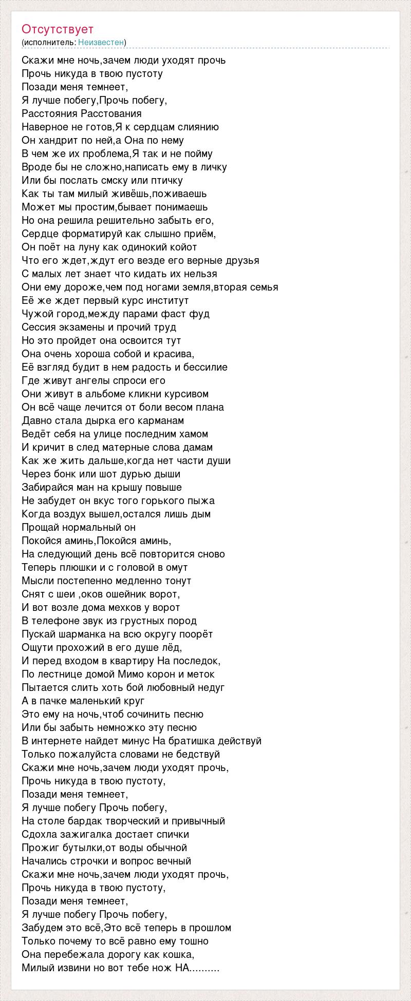 Скажи мне ночь,зачем люди уходят прочь Прочь никуда в твою пустоту Позади меня темнеет, Я лучше побегу,Прочь побегу, Расстояния Расстования Наверное не готов,Я к сердцам слиянию Он хандрит по ней,а Она по нему В чем же их проблема,Я так и не пойму Вроде бы не сложно,написать ему в личку Или бы послать смску или птичку Как ты там милый живёшь,поживаешь Может мы простим,бывает понимаешь Но она решила решительно забыть его, Сердце форматируй как слышно приём, Он поёт на луну как одинокий койот Что его ждет,ждут его везде его верные друзья С малых лет знает что кидать их нельзя Они ему дороже,чем под ногами земля,вторая семья Её же ждет первый курс институт Чужой город,между парами фаст фуд Сессия экзамены и прочий труд Но это пройдет она освоится тут Она очень хороша собой и красива, Её взгляд будит в нем радость и бессилие Где живут ангелы спроси его Они живут в альбоме кликни курсивом Он всё чаще лечится от боли весом плана Давно стала дырка его карманам Ведёт себя на улице последним хамом И кричит в след матерные слова дамам Как же жить дальше,когда нет части души Через бонк или шот дурью дыши Забирайся ман на крышу повыше Не забудет он вкус того горького пыжа Когда воздух вышел,остался лишь дым Прощай нормальный он Покойся аминь,Покойся аминь, На следующий день всё повторится сново Теперь плюшки и с головой в омут Мысли постепенно медленно тонут Снят с шеи ,оков ошейник ворот, И вот возле дома мехков у ворот В телефоне звук из грустных пород Пускай шарманка на всю округу поорёт Ощути прохожий в его душе лёд, И перед входом в квартиру На последок, По лестнице домой Мимо корон и меток Пытается слить хоть бой любовный недуг А в пачке маленький круг Это ему на ночь,чтоб сочинить песню Или бы забыть немножко эту песню В интернете найдет минус На братишка действуй Только пожалуйста словами не бедствуй Скажи мне ночь,зачем люди уходят прочь, Прочь никуда в твою пустоту, Позади меня темнеет, Я лучше побегу Прочь побегу, На столе бардак творческий и привычный Сдохла зажигалка достает спички Прожиг бутылки,от воды обычной Начались строчки и вопрос вечный Скажи мне ночь,зачем люди уходят прочь, Прочь никуда в твою пустоту, Позади меня темнеет, Я лучше побегу Прочь побегу, Забудем это всё,Это всё теперь в прошлом Только почему то всё равно ему тошно Она перебежала дорогу как кошка, Милый извини но вот тебе нож НА..........