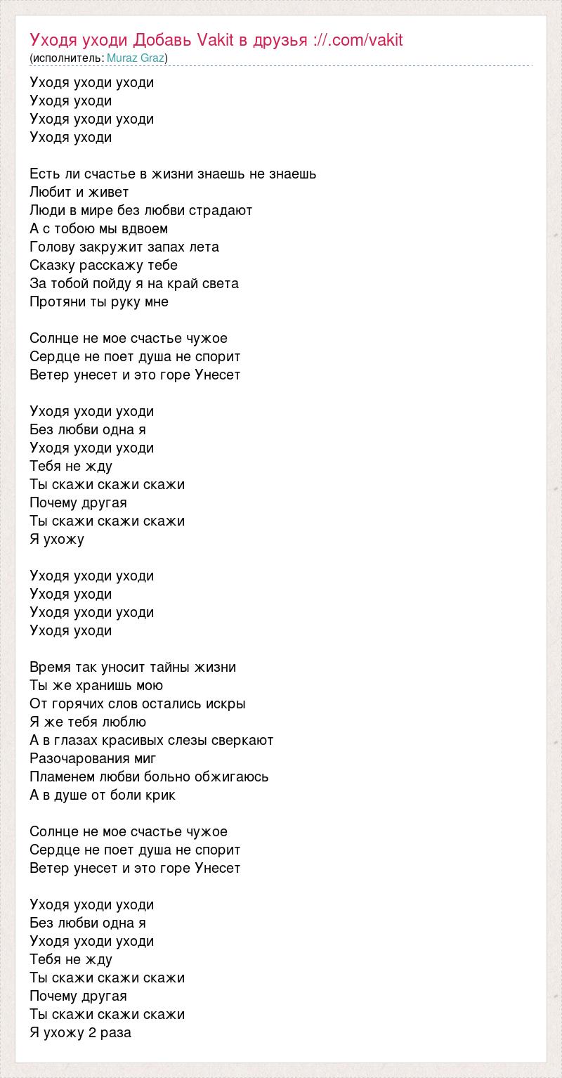 Уходя уходи уходи Уходя уходи Уходя уходи уходи Уходя уходи Есть ли счастье в жизни знаешь не знаешь Любит и живет Люди в мире без любви страдают А с тобою мы вдвоем Голову закружит запах лета Сказку расскажу тебе За тобой пойду я на край света Протяни ты руку мне Солнце не мое счастье чужое Сердце не поет душа не спорит Ветер унесет и это горе Унесет Уходя уходи уходи Без любви одна я Уходя уходи уходи Тебя не жду Ты скажи скажи скажи Почему другая Ты скажи скажи скажи Я ухожу Уходя уходи уходи Уходя уходи Уходя уходи уходи Уходя уходи Время так уносит тайны жизни Ты же хранишь мою От горячих слов остались искры Я же тебя люблю А в глазах красивых слезы сверкают Разочарования миг Пламенем любви больно обжигаюсь А в душе от боли крик Солнце не мое счастье чужое Сердце не поет душа не спорит Ветер унесет и это горе Унесет Уходя уходи уходи Без любви одна я Уходя уходи уходи Тебя не жду Ты скажи скажи скажи Почему другая Ты скажи скажи скажи Я ухожу 2 раза