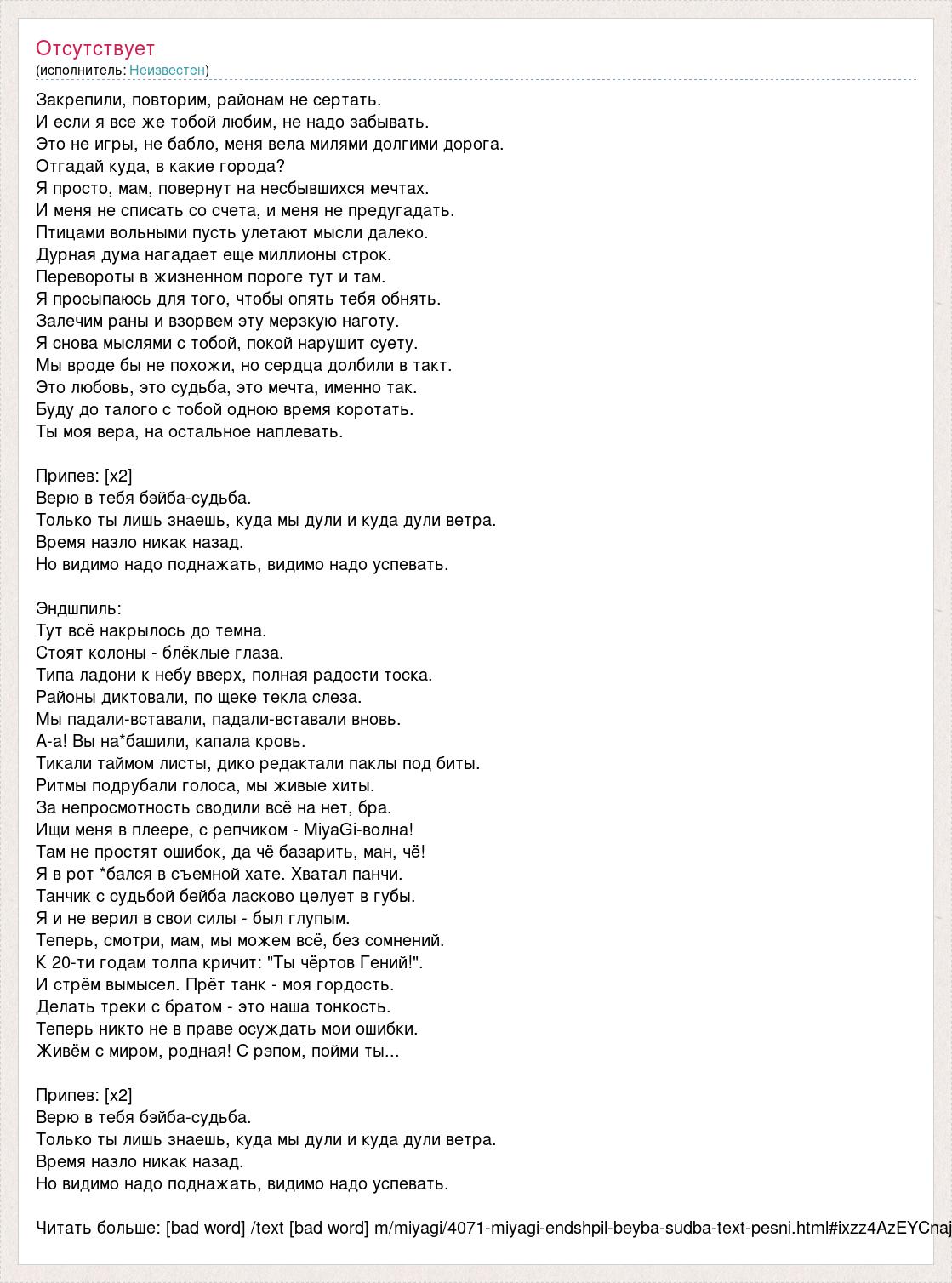 Закрепили, повторим, районам не сертать. И если я все же тобой любим, не надо забывать. Это не игры, не бабло, меня вела милями долгими дорога. Отгадай куда, в какие города? Я просто, мам, повернут на несбывшихся мечтах. И меня не списать со счета, и меня не предугадать. Птицами вольными пусть улетают мысли далеко. Дурная дума нагадает еще миллионы строк. Перевороты в жизненном пороге тут и там. Я просыпаюсь для того, чтобы опять тебя обнять. Залечим раны и взорвем эту мерзкую наготу. Я снова мыслями с тобой, покой нарушит суету. Мы вроде бы не похожи, но сердца долбили в такт. Это любовь, это судьба, это мечта, именно так. Буду до талого с тобой одною время коротать. Ты моя вера, на остальное наплевать. Припев: [x2] Верю в тебя бэйба-судьба. Только ты лишь знаешь, куда мы дули и куда дули ветра. Время назло никак назад. Но видимо надо поднажать, видимо надо успевать. Эндшпиль: Тут всё накрылось до темна. Стоят колоны - блёклые глаза. Типа ладони к небу вверх, полная радости тоска. Районы диктовали, по щеке текла слеза. Мы падали-вставали, падали-вставали вновь. А-а! Вы на*башили, капала кровь. Тикали таймом листы, дико редактали паклы под биты. Ритмы подрубали голоса, мы живые хиты. За непросмотность сводили всё на нет, бра. Ищи меня в плеере, с репчиком - MiyaGi-волна! Там не простят ошибок, да чё базарить, ман, чё! Я в рот *бался в съемной хате. Хватал панчи. Танчик с судьбой бейба ласково целует в губы. Я и не верил в свои силы - был глупым. Теперь, смотри, мам, мы можем всё, без сомнений. К 20-ти годам толпа кричит: "Ты чёртов Гений!". И стрём вымысел. Прёт танк - моя гордость. Делать треки с братом - это наша тонкость. Теперь никто не в праве осуждать мои ошибки. Живём с миром, родная! С рэпом, пойми ты... Припев: [x2] Верю в тебя бэйба-судьба. Только ты лишь знаешь, куда мы дули и куда дули ветра. Время назло никак назад. Но видимо надо поднажать, видимо надо успевать. Читать больше: [bad word] /text [bad word] m/miyagi/4071-miyagi-endshpil-beyba-sudba-text-pesni.html#ixzz4AzEYCnaj