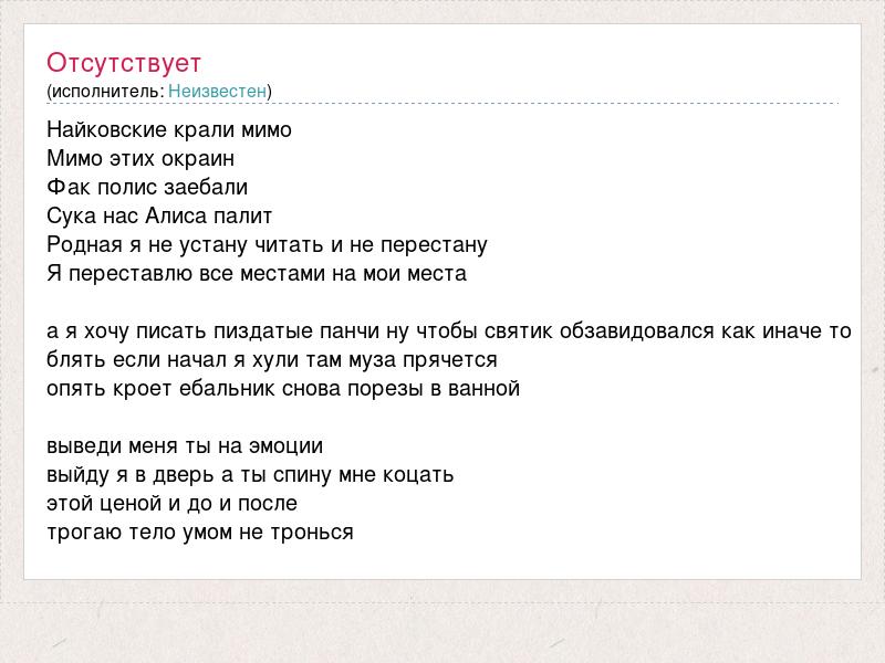 Найковские крали мимо Мимо этих окраин Фак полис заебали Сука нас Алиса палит Родная я не устану читать и не перестану Я переставлю все местами на мои места а я хочу писать пиздатые панчи ну чтобы святик обзавидовался как иначе то блять если начал я хули там муза прячется опять кроет ебальник снова порезы в ванной выведи меня ты на эмоции выйду я в дверь а ты спину мне коцать этой ценой и до и после трогаю тело умом не тронься