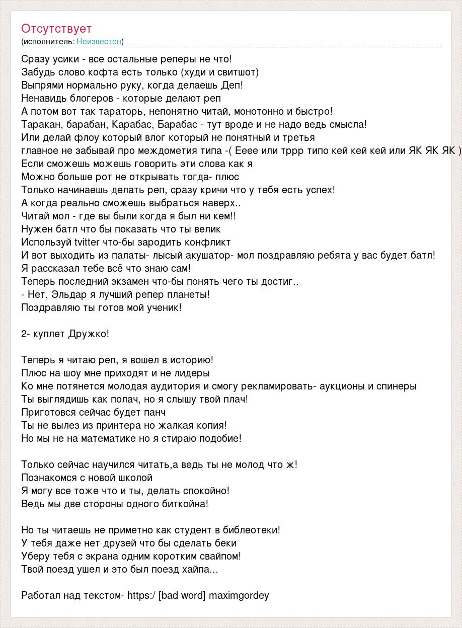Сразу усики - все остальные реперы не что! Забудь слово кофта есть только (худи и свитшот) Выпрями нормально руку, когда делаешь Деп! Ненавидь блогеров - которые делают реп А потом вот так тараторь, непонятно читай, монотонно и быстро! Таракан, барабан, Карабас, Барабас - тут вроде и не надо ведь смысла! Или делай флоу который влог который не понятный и третья главное не забывай про междометия типа -( Ееее или тррр типо кей кей кей или ЯК ЯК ЯК ) Если сможешь можешь говорить эти слова как я Можно больше рот не открывать тогда- плюс Только начинаешь делать реп, сразу кричи что у тебя есть успех! А когда реально сможешь выбраться наверх.. Читай мол - где вы были когда я был ни кем!! Нужен батл что бы показать что ты велик Используй tvitter что-бы зародить конфликт И вот выходить из палаты- лысый акушатор- мол поздравляю ребята у вас будет батл! Я рассказал тебе всё что знаю сам! Теперь последний экзамен что-бы понять чего ты достиг.. - Нет, Эльдар я лучший репер планеты! Поздравляю ты готов мой ученик! 2- куплет Дружко! Теперь я читаю реп, я вошел в историю! Плюс на шоу мне приходят и не лидеры Ко мне потянется молодая аудитория и смогу рекламировать- аукционы и спинеры Ты выглядишь как полач, но я слышу твой плач! Приготовся сейчас будет панч Ты не вылез из принтера но жалкая копия! Но мы не на математике но я стираю подобие! Только сейчас научился читать,а ведь ты не молод что ж! Познакомся с новой школой Я могу все тоже что и ты, делать спокойно! Ведь мы две стороны одного биткойна! Но ты читаешь не приметно как студент в библеотеки! У тебя даже нет друзей что бы сделать беки Уберу тебя с экрана одним коротким свайпом! Твой поезд ушел и это был поезд хайпа... Работал над текстом- https:/ [bad word] maximgordey