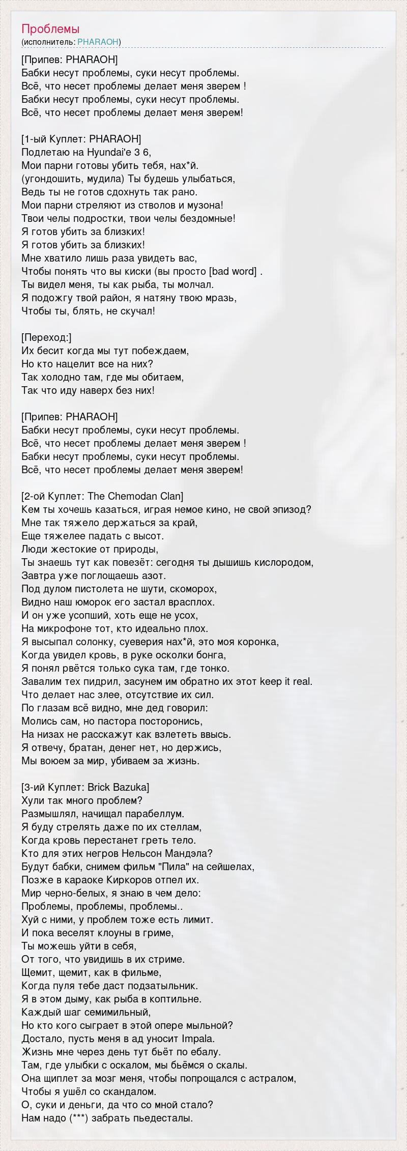 [Припев: PHARAOH] Бабки несут проблемы, суки несут проблемы. Всё, что несет проблемы делает меня зверем ! Бабки несут проблемы, суки несут проблемы. Всё, что несет проблемы делает меня зверем! [1-ый Куплет: PHARAOH] Подлетаю на Hyundai'e 3 6, Мои парни готовы убить тебя, нах*й. (угондошить, мудила) Ты будешь улыбаться, Ведь ты не готов сдохнуть так рано. Мои парни стреляют из стволов и музона! Твои челы подростки, твои челы бездомные! Я готов убить за близких! Я готов убить за близких! Мне хватило лишь раза увидеть вас, Чтобы понять что вы киски (вы просто [bad word] . Ты видел меня, ты как рыба, ты молчал. Я подожгу твой район, я натяну твою мразь, Чтобы ты, блять, не скучал! [Переход:] Их бесит когда мы тут побеждаем, Но кто нацелит все на них? Так холодно там, где мы обитаем, Так что иду наверх без них! [Припев: PHARAOH] Бабки несут проблемы, суки несут проблемы. Всё, что несет проблемы делает меня зверем ! Бабки несут проблемы, суки несут проблемы. Всё, что несет проблемы делает меня зверем! [2-ой Куплет: The Chemodan Clan] Кем ты хочешь казаться, играя немое кино, не свой эпизод? Мне так тяжело держаться за край, Еще тяжелее падать с высот. Люди жестокие от природы, Ты знаешь тут как повезёт: сегодня ты дышишь кислородом, Завтра уже поглощаешь азот. Под дулом пистолета не шути, скоморох, Видно наш юморок его застал врасплох. И он уже усопший, хоть еще не усох, На микрофоне тот, кто идеально плох. Я высыпал солонку, суеверия нах*й, это моя коронка, Когда увидел кровь, в руке осколки бонга, Я понял рвётся только сука там, где тонко. Завалим тех пидрил, засунем им обратно их этот keep it real. Что делает нас злее, отсутствие их сил. По глазам всё видно, мне дед говорил: Молись сам, но пастора посторонись, На низах не расскажут как взлететь ввысь. Я отвечу, братан, денег нет, но держись, Мы воюем за мир, убиваем за жизнь. [3-ий Куплет: Brick Bazuka] Хули так много проблем? Размышлял, начищал парабеллум. Я буду стрелять даже по их стеллам, Когда кровь перестанет греть тело. Кто для этих негров Нельсон Мандэла? Будут бабки, снимем фильм "Пила" на сейшелах, Позже в караоке Киркоров отпел их. Мир черно-белых, я знаю в чем дело: Проблемы, проблемы, проблемы.. Хуй с ними, у проблем тоже есть лимит. И пока веселят клоуны в гриме, Ты можешь уйти в себя, От того, что увидишь в их стриме. Щемит, щемит, как в фильме, Когда пуля тебе даст подзатыльник. Я в этом дыму, как рыба в коптильне. Каждый шаг семимильный, Но кто кого сыграет в этой опере мыльной? Достало, пусть меня в ад уносит Impala. Жизнь мне через день тут бьёт по ебалу. Там, где улыбки с оскалом, мы бьёмся о скалы. Она щиплет за мозг меня, чтобы попрощался с астралом, Чтобы я ушёл со скандалом. О, суки и деньги, да что со мной стало? Нам надо (***) забрать пьедесталы.