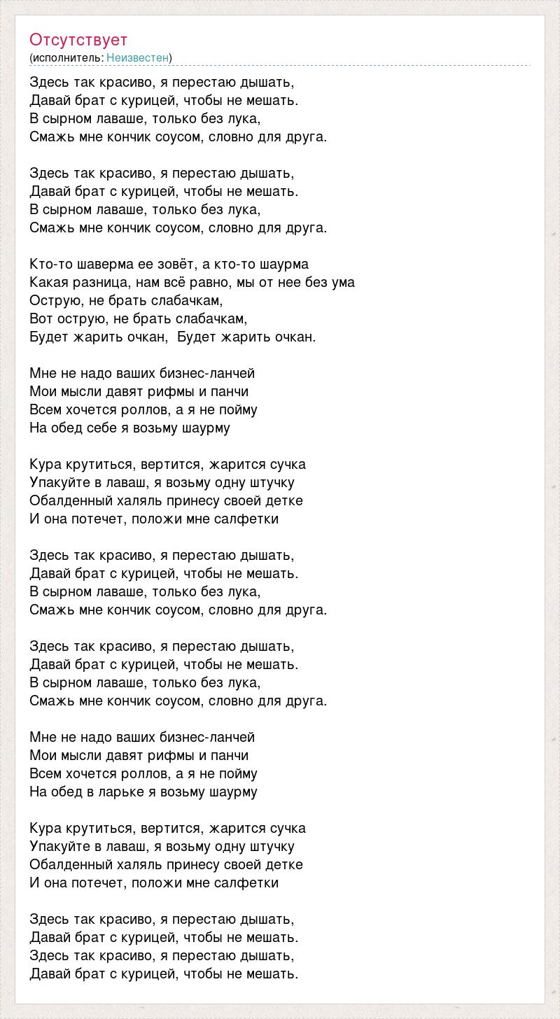 Здесь так красиво, я перестаю дышать, Давай брат с курицей, чтобы не мешать. В сырном лаваше, только без лука, Смажь мне кончик соусом, словно для друга. Здесь так красиво, я перестаю дышать, Давай брат с курицей, чтобы не мешать. В сырном лаваше, только без лука, Смажь мне кончик соусом, словно для друга. Кто-то шаверма ее зовёт, а кто-то шаурма Какая разница, нам всё равно, мы от нее без ума Острую, не брать слабачкам, Вот острую, не брать слабачкам, Будет жарить очкан, Будет жарить очкан. Мне не надо ваших бизнес-ланчей Мои мысли давят рифмы и панчи Всем хочется роллов, а я не пойму На обед себе я возьму шаурму Кура крутиться, вертится, жарится сучка Упакуйте в лаваш, я возьму одну штучку Обалденный халяль принесу своей детке И она потечет, положи мне салфетки Здесь так красиво, я перестаю дышать, Давай брат с курицей, чтобы не мешать. В сырном лаваше, только без лука, Смажь мне кончик соусом, словно для друга. Здесь так красиво, я перестаю дышать, Давай брат с курицей, чтобы не мешать. В сырном лаваше, только без лука, Смажь мне кончик соусом, словно для друга. Мне не надо ваших бизнес-ланчей Мои мысли давят рифмы и панчи Всем хочется роллов, а я не пойму На обед в ларьке я возьму шаурму Кура крутиться, вертится, жарится сучка Упакуйте в лаваш, я возьму одну штучку Обалденный халяль принесу своей детке И она потечет, положи мне салфетки Здесь так красиво, я перестаю дышать, Давай брат с курицей, чтобы не мешать. Здесь так красиво, я перестаю дышать, Давай брат с курицей, чтобы не мешать.