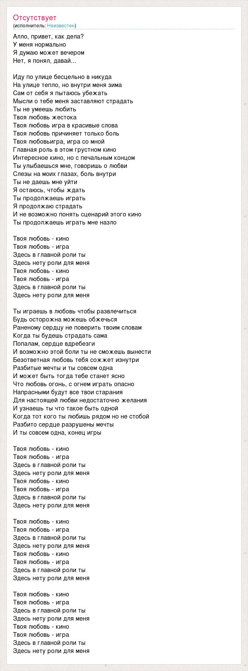 Алло, привет, как дела? У меня нормально Я думаю может вечером Нет, я понял, давай... Иду по улице бесцельно в никуда На улице тепло, но внутри меня зима Сам от себя я пытаюсь убежать Мысли о тебе меня заставляют страдать Ты не умеешь любить Твоя любовь жестока Твоя любовь игра в красивые слова Твоя любовь причиняет только боль Твоя любовьигра, игра со мной Главная роль в этом грустном кино Интересное кино, но с печальным концом Ты улыбаешься мне, говоришь о любви Слезы на моих глазах, боль внутри Ты не даешь мне уйти Я остаюсь, чтобы ждать Ты продолжаешь играть Я продолжаю страдать И не возможно понять сценарий этого кино Ты продолжаешь играть мне назло Твоя любовь - кино Твоя любовь - игра Здесь в главной роли ты Здесь нету роли для меня Твоя любовь - кино Твоя любовь - игра Здесь в главной роли ты Здесь нету роли для меня Ты играешь в любовь чтобы развлечиться Будь осторожна можешь обжечься Раненому сердцу не поверить твоим словам Когда ты будешь страдать сама Попалам, сердце вдребезги И возможно этой боли ты не сможешь вынести Безответная любовь тебя сожжет изнутри Разбитые мечты и ты совсем одна И может быть тогда тебе станет ясно Что любовь огонь, с огнем играть опасно Напрасными будут все твои старания Для настоящей любви недостаточно желания И узнаешь ты что такое быть одной Когда тот кого ты любишь рядом но не стобой Разбито сердце разрушены мечты И ты совсем одна, конец игры Твоя любовь - кино Твоя любовь - игра Здесь в главной роли ты Здесь нету роли для меня Твоя любовь - кино Твоя любовь - игра Здесь в главной роли ты Здесь нету роли для меня Твоя любовь - кино Твоя любовь - игра Здесь в главной роли ты Здесь нету роли для меня Твоя любовь - кино Твоя любовь - игра Здесь в главной роли ты Здесь нету роли для меня Твоя любовь - кино Твоя любовь - игра Здесь в главной роли ты Здесь нету роли для меня Твоя любовь - кино Твоя любовь - игра Здесь в главной роли ты Здесь нету роли для меня