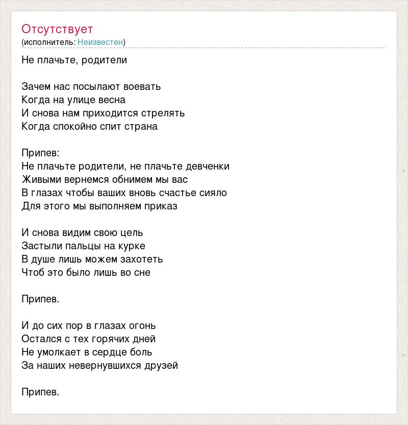 Не плачьте, родители Зачем нас посылают воевать Когда на улице весна И снова нам приходится стрелять Когда спокойно спит страна Припев: Не плачьте родители, не плачьте девченки Живыми вернемся обнимем мы вас В глазах чтобы ваших вновь счастье сияло Для этого мы выполняем приказ И снова видим свою цель Застыли пальцы на курке В душе лишь можем захотеть Чтоб это было лишь во сне Припев. И до сих пор в глазах огонь Остался с тех горячих дней Не умолкает в сердце боль За наших невернувшихся друзей Припев.