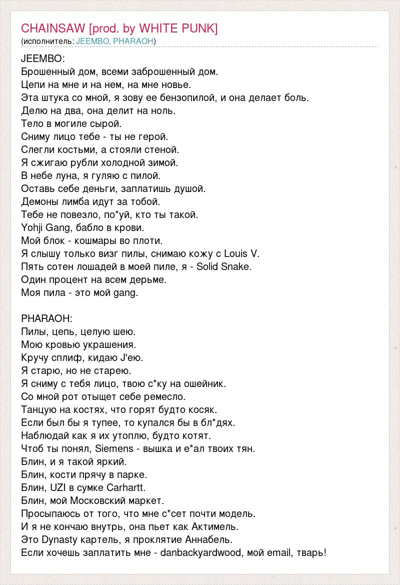 JEEMBO: Брошенный дом, всеми заброшенный дом. Цепи на мне и на нем, на мне новье. Эта штука со мной, я зову ее бензопилой, и она делает боль. Делю на два, она делит на ноль. Тело в могиле сырой. Сниму лицо тебе - ты не герой. Слегли костьми, а стояли стеной. Я сжигаю рубли холодной зимой. В небе луна, я гуляю с пилой. Оставь себе деньги, заплатишь душой. Демоны лимба идут за тобой. Тебе не повезло, по*уй, кто ты такой. Yohji Gang, бабло в крови. Мой блок - кошмары во плоти. Я слышу только визг пилы, снимаю кожу с Louis V. Пять сотен лошадей в моей пиле, я - Solid Snake. Один процент на всем дерьме. Моя пила - это мой gang. PHARAOH: Пилы, цепь, целую шею. Мою кровью украшения. Кручу сплиф, кидаю J'ею. Я старю, но не старею. Я сниму с тебя лицо, твою с*ку на ошейник. Со мной рот отыщет себе ремесло. Танцую на костях, что горят будто косяк. Если был бы я тупее, то купался бы в бл*дях. Наблюдай как я их утоплю, будто котят. Чтоб ты понял, Siemens - вышка и е*ал твоих тян. Блин, и я такой яркий. Блин, кости прячу в парке. Блин, UZI в сумке Carhartt. Блин, мой Московский маркет. Просыпаюсь от того, что мне с*сет почти модель. И я не кончаю внутрь, она пьет как Актимель. Это Dynasty картель, я проклятие Аннабель. Если хочешь заплатить мне - danbackyardwood, мой email, тварь!
