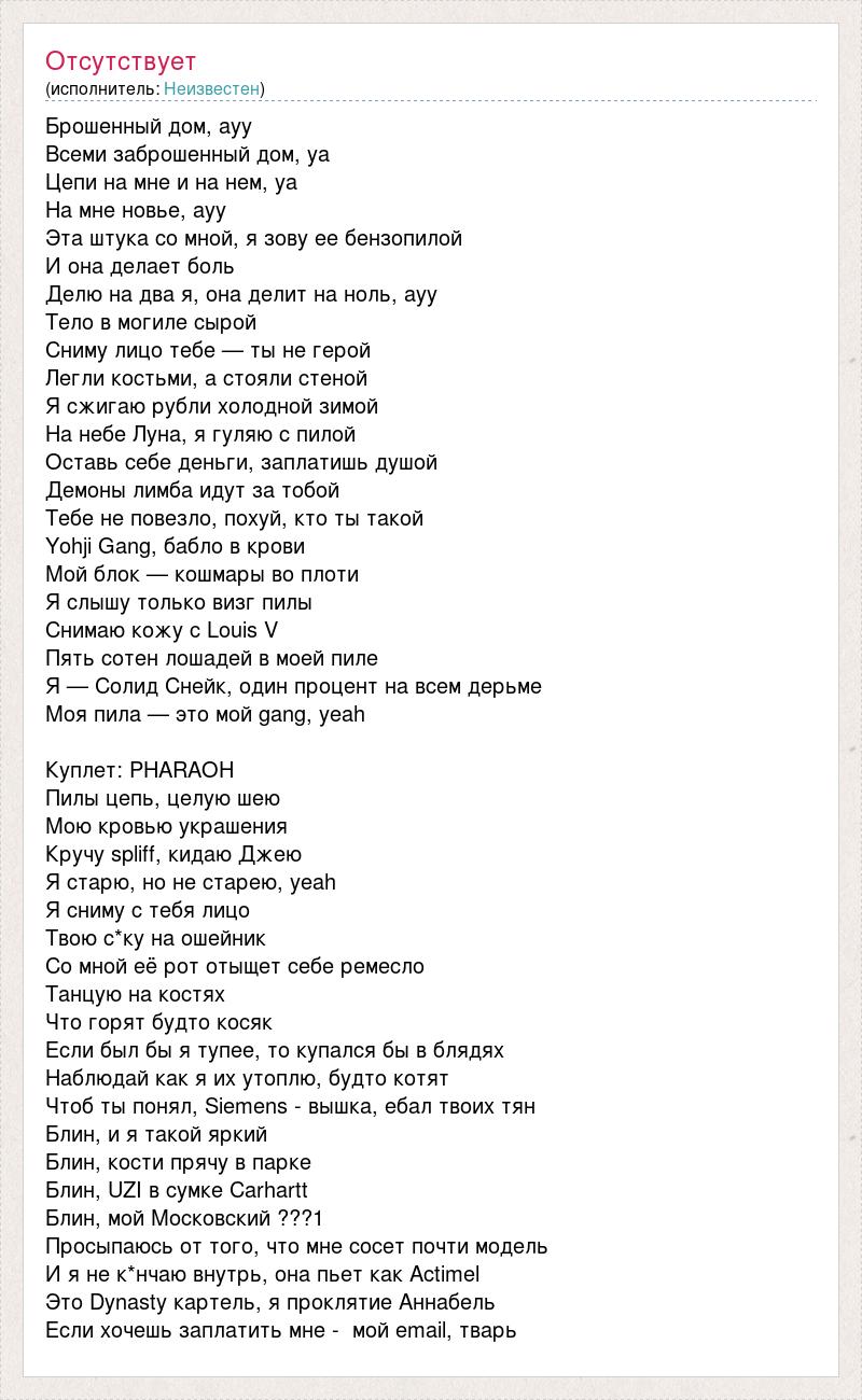 Брошенный дом, ayy Всеми заброшенный дом, ya Цепи на мне и на нем, ya На мне новье, ayy Эта штука со мной, я зову ее бензопилой И она делает боль Делю на два я, она делит на ноль, ayy Тело в могиле сырой Сниму лицо тебе — ты не герой Легли костьми, а стояли стеной Я сжигаю рубли холодной зимой На небе Луна, я гуляю с пилой Оставь себе деньги, заплатишь душой Демоны лимба идут за тобой Тебе не повезло, похуй, кто ты такой Yohji Gang, бабло в крови Мой блок — кошмары во плоти Я слышу только визг пилы Снимаю кожу с Louis V Пять сотен лошадей в моей пиле Я — Солид Снейк, один процент на всем дерьме Моя пила — это мой gang, yeah Куплет: PHARAOH Пилы цепь, целую шею Мою кровью украшения Кручу spliff, кидаю Джею Я старю, но не старею, yeah Я сниму с тебя лицо Твою с*ку на ошейник Со мной её рот отыщет себе ремесло Танцую на костях Что горят будто косяк Если был бы я тупее, то купался бы в блядях Наблюдай как я их утоплю, будто котят Чтоб ты понял, Siemens - вышка, ебал твоих тян Блин, и я такой яркий Блин, кости прячу в парке Блин, UZI в сумке Carhartt Блин, мой Московский ???1 Просыпаюсь от того, что мне сосет почти модель И я не к*нчаю внутрь, она пьет как Actimel Это Dynasty картель, я проклятие Аннабель Если хочешь заплатить мне - мой email, тварь