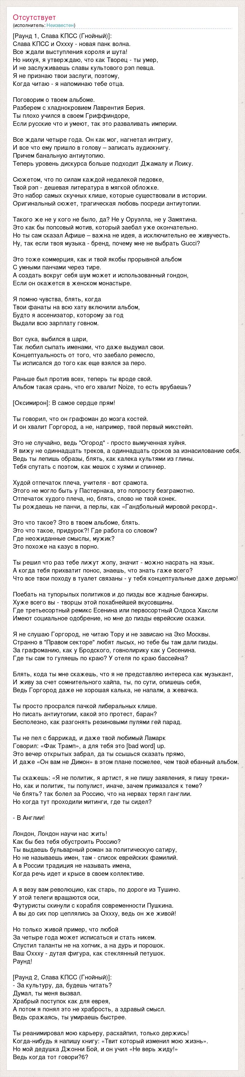 [Раунд 1, Слава КПСС (Гнойный)]: Слава КПСС и Oxxxy - новая панк волна. Все ждали выступления короля и шута! Но нихуя, я утверждаю, что как Творец - ты умер, И не заслуживаешь славы культового рэп певца. Я не признаю твои заслуги, поэтому, Когда читаю - я напоминаю тебе отца. Поговорим о твоем альбоме. Разберем с хладнокровием Лаврентия Берия. Ты плохо учился в своем Гриффиндоре, Если русские что и умеют, так это разваливать империи. Все ждали четыре года. Он как мог, нагнетал интригу, И все что ему пришло в голову – записать аудиокнигу. Причем банальную антиутопию. Теперь уровень дискурса больше подходит Джамалу и Лоику. Сюжетом, что по силам каждой недалекой педовке, Твой рэп - дешевая литература в мягкой обложке. Это набор самых скучных клише, которые существовали в истории. Оригинальный сюжет, трагическая любовь посреди антиутопии. Такого же не у кого не было, да? Не у Оруэлла, не у Замятина. Это как бы попсовый мотив, который заебал уже окончательно. Но ты сам сказал Афише – важна не идея, а исключительно ее живучесть. Ну, так если твоя музыка - бренд, почему мне не выбрать Gucci? Это тоже коммерция, как и твой якобы прорывной альбом С умными панчами через тире. А создать вокруг себя шум может и использованный гондон, Если он окажется в женском монастыре. Я помню чувства, блять, когда Твои фанаты на всю хату включили альбом, Будто я ассенизатор, которому за год Выдали всю зарплату говном. Вот сука, выбился в цари, Так любил сыпать именами, что даже выдумал свои. Концептуальность от того, что заебало ремесло, Ты исписался до того как еще взялся за перо. Раньше был против всех, теперь ты вроде свой. Альбом такая срань, что его хвалит Noize, то есть врубаешь? [Оксимирон]: В самое сердце прям! Ты говорил, что он графоман до мозга костей. И он хвалит Горгород, а не, например, твой первый микстейп. Это не случайно, ведь "Огород" - просто вымученная хуйня. Я вижу не одиннадцать треков, а одиннадцать сроков за изнасилование себя. Ведь ты лепишь образы, блять, как калека культями из глины. Тебя спутать с поэтом, как мешок с хуями и спиннер. Худой отпечаток плеча, учителя - вот срамота. Этого не могло быть у Пастернака, это попросту безграмотно. Отпечаток худого плеча, но, блять, слово не твой конек. Ты рождаешь не панчи, а перлы, как «Гандбольный мировой рекорд». Это что такое? Это в твоем альбоме, блять. Это что такое, придурок?! Где работа со словом? Где неожиданные смыслы, мужик? Это похоже на казус в порно. Ты решил что раз тебе лижут жопу, значит - можно насрать на язык. А когда тебя прихватит понос, знаешь, что знать гаже всего? Что все твои походу в туалет связаны - у тебя концептуальные даже дерьмо! Поебать на тупорылых политиков и до пизды все жадные банкиры. Хуже всего вы - творцы этой похабнейшей вкусовщины. Где третьесортный ремикс Есенина или первосортный Олдоса Хаксли Имеют социальное одобрение, но мне до пизды еврейские сказки. Я не слушаю Горгород, не читаю Тору и не зависаю на Эхо Москвы. Странно в "Правом секторе" любят лысых, но тебе бы там дали пизды. За графоманию, как у Бродского, говнолирику как у Сесенина. Где ты сам то гуляешь по краю? У отеля по краю бассейна? Блять, кода ты мне скажешь, что я не представляю интереса как музыкант, И живу за счет сомнительного хайпа, ты, по сути, опишешь себя, Ведь Горгород даже не хорошая калька, не напалм, а жевачка. Ты просто просрался пачк
