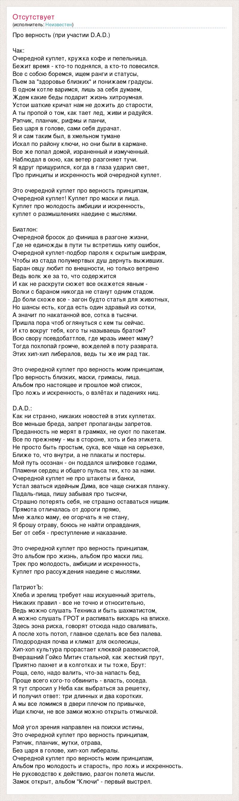 Про верность (при участии D.A.D.) Чак: Очередной куплет, кружка кофе и пепельница. Бежит время - кто-то поднялся, а кто-то повесился. Все с собою боремся, ищем ранги и статусы, Пьем за "здоровье близких" и понижаем градусы. В одном котле варимся, лишь за себя думаем, Ждем какие беды подарит жизнь хитроумная. Устои шаткие кричат нам не дожить до старости, А ты пропой о том, как тает лед, живи и радуйся. Рэпчик, планчик, рифмы и панчи, Без царя в голове, сами себя дурачат. Я и сам таким был, в хмельном тумане Искал по району ключи, но они были в кармане. Все же попал домой, израненный и измученный. Наблюдал в окно, как ветер разгоняет тучи. Я вдруг прищурился, когда в глаза ударил свет, Про принципы и искренность мой очередной куплет. Это очередной куплет про верность принципам, Очередной куплет! Куплет про маски и лица. Куплет про молодость амбиции и искренность, куплет о размышлениях наедине с мыслями. Биатлон: Очередной бросок до финиша в разгоне жизни, Где не единожды в пути ты встретишь кипу ошибок, Очередной куплет-подбор пароля к скрытым шифрам, Чтобы из стада полумертвых душ дернуть выживших. Баран овцу любит по внешности, но только ветрено Ведь волк же за то, что содержится И как не раскрути сюжет все окажется явным - Волки с бараном никогда не станут одним стадом. До боли схоже все - загон будто статья для животных, Но шансы есть, когда есть один здравый из сотки, А значит по накатанной все, сотка в тысячи. Пришла пора чтоб оглянуться с кем ты сейчас. И кто вокруг тебя, кого ты называешь братом? Всю свору псевдобаттлов, где мразь имеет маму? Тогда похлопай громче, вожделей в поту разврата. Этих хип-хип либералов, ведь ты же им рад так. Это очередной куплет про верность моим принципам, Про верность близких, маски, гримасы, лица. Альбом про настоящее и прошлое мой список, Про ложь и искренность, о взлётах и падениях ниц. D.A.D.: Как ни странно, никаких новостей в этих куплетах. Все меньше бреда, запрет пропаганды запретов. Преданность не мерят в граммах, не суют по пакетам. Все по прежнему - мы в стороне, хоть и без этикета. Не просто быть простым, сука, все чаще на серьезке, Ближе то, что внутри, а не плакаты и постеры. Мой путь осознан - он поддался шлифовке годами, Пламени сердец и общего пульса тех, кто за нами. Очередной куплет не про штакеты и банки, Устал зваться идейным Дима, все чаще снижая планку. Падаль-пища, пишу забывая про тысячи, Страшно потерять себя, не страшно оставаться нищим. Прямота отличалась от дороги прямо, Мне жалко маму, ее огорчать я не стану, Я брошу отраву, боюсь не найти оправдания, Бег от себя - преступление и наказание. Это очередной куплет про верность принципам, Это альбом про жизнь, альбом про маски лиц. Трек про молодость, амбиции и искренность, Куплет про рассуждения наедине с мыслями. ПатриотЪ: Хлеба и зрелищ требует наш искушенный зритель, Никаких правил - все не точно и относительно, Ведь можно слушать Техника и быть шахматистом, А можно слушать ГРОТ и распивать вискарь на вписке. Здесь зона риска, говорят отсюда надо сваливать, А после хоть потоп, главное сделать все без палева. Плодородная почва и климат для околесицы, Хип-хоп культура прорастает клюквой развесистой, Вчерашний Гойко Митич стальной, как жесткий прут, Приятно пахнет и в колготках и ты тоже, Брут: Роща, село, надо валить, что-за напасть бед, Проще всего кого-то обвинить - власт