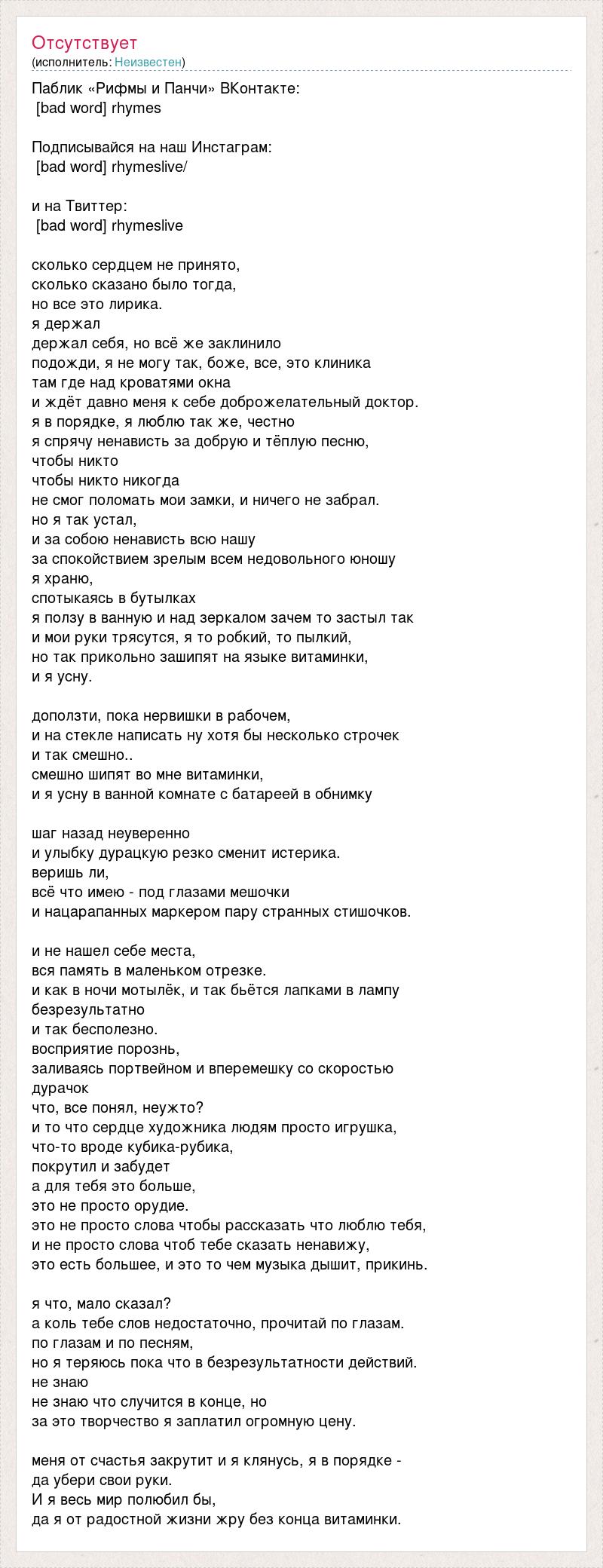 Паблик «Рифмы и Панчи» ВКонтакте: [bad word] rhymes Подписывайся на наш Инстаграм: [bad word] rhymeslive/ и на Твиттер: [bad word] rhymeslive сколько сердцем не принято, сколько сказано было тогда, но все это лирика. я держал держал себя, но всё же заклинило подожди, я не могу так, боже, все, это клиника там где над кроватями окна и ждёт давно меня к себе доброжелательный доктор. я в порядке, я люблю так же, честно я спрячу ненависть за добрую и тёплую песню, чтобы никто чтобы никто никогда не смог поломать мои замки, и ничего не забрал. но я так устал, и за собою ненависть всю нашу за спокойствием зрелым всем недовольного юношу я храню, спотыкаясь в бутылках я ползу в ванную и над зеркалом зачем то застыл так и мои руки трясутся, я то робкий, то пылкий, но так прикольно зашипят на языке витаминки, и я усну. доползти, пока нервишки в рабочем, и на стекле написать ну хотя бы несколько строчек и так смешно.. смешно шипят во мне витаминки, и я усну в ванной комнате с батареей в обнимку шаг назад неуверенно и улыбку дурацкую резко сменит истерика. веришь ли, всё что имею - под глазами мешочки и нацарапанных маркером пару странных стишочков. и не нашел себе места, вся память в маленьком отрезке. и как в ночи мотылёк, и так бьётся лапками в лампу безрезультатно и так бесполезно. восприятие порознь, заливаясь портвейном и вперемешку со скоростью дурачок что, все понял, неужто? и то что сердце художника людям просто игрушка, что-то вроде кубика-рубика, покрутил и забудет а для тебя это больше, это не просто орудие. это не просто слова чтобы рассказать что люблю тебя, и не просто слова чтоб тебе сказать ненавижу, это есть большее, и это то чем музыка дышит, прикинь. я что, мало сказал? а коль тебе слов недостаточно, прочитай по глазам. по глазам и по песням, но я теряюсь пока что в безрезультатности действий. не знаю не знаю что случится в конце, но за это творчество я заплатил огромную цену. меня от счастья закрутит и я клянусь, я в порядке - да убери свои руки. И я весь мир полюбил бы, да я от радостной жизни жру без конца витаминки.