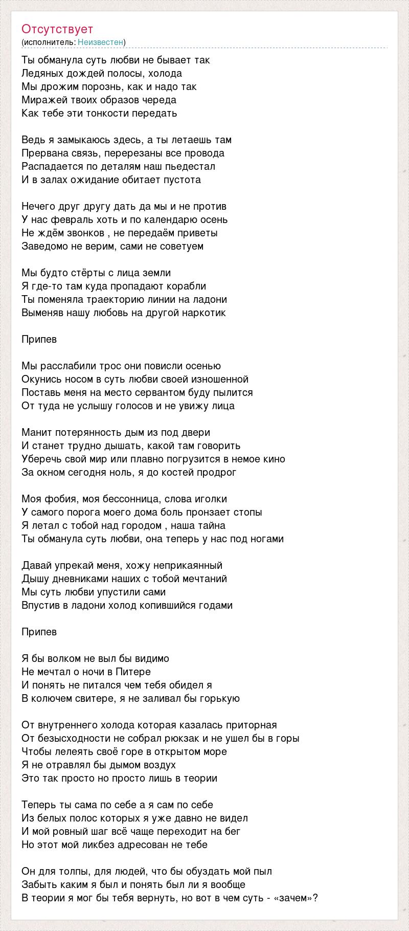 Ты обманула суть любви не бывает так Ледяных дождей полосы, холода Мы дрожим порознь, как и надо так Миражей твоих образов череда Как тебе эти тонкости передать Ведь я замыкаюсь здесь, а ты летаешь там Прервана связь, перерезаны все провода Распадается по деталям наш пьедестал И в залах ожидание обитает пустота Нечего друг другу дать да мы и не против У нас февраль хоть и по календарю осень Не ждём звонков , не передаём приветы Заведомо не верим, сами не советуем Мы будто стёрты с лица земли Я где-то там куда пропадают корабли Ты поменяла траекторию линии на ладони Выменяв нашу любовь на другой наркотик Припев Мы расслабили трос они повисли осенью Окунись носом в суть любви своей изношенной Поставь меня на место сервантом буду пылится От туда не услышу голосов и не увижу лица Манит потерянность дым из под двери И станет трудно дышать, какой там говорить Уберечь свой мир или плавно погрузится в немое кино За окном сегодня ноль, я до костей продрог Моя фобия, моя бессонница, слова иголки У самого порога моего дома боль пронзает стопы Я летал с тобой над городом , наша тайна Ты обманула суть любви, она теперь у нас под ногами Давай упрекай меня, хожу неприкаянный Дышу дневниками наших с тобой мечтаний Мы суть любви упустили сами Впустив в ладони холод копившийся годами Припев Я бы волком не выл бы видимо Не мечтал о ночи в Питере И понять не питался чем тебя обидел я В колючем свитере, я не заливал бы горькую От внутреннего холода которая казалась приторная От безысходности не собрал рюкзак и не ушел бы в горы Чтобы лелеять своё горе в открытом море Я не отравлял бы дымом воздух Это так просто но просто лишь в теории Теперь ты сама по себе а я сам по себе Из белых полос которых я уже давно не видел И мой ровный шаг всё чаще переходит на бег Но этот мой ликбез адресован не тебе Он для толпы, для людей, что бы обуздать мой пыл Забыть каким я был и понять был ли я вообще В теории я мог бы тебя вернуть, но вот в чем суть - «зачем»?