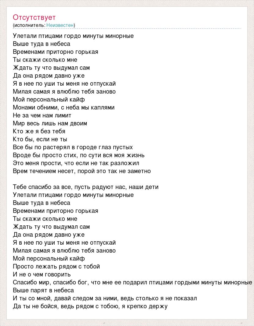 Улетали птицами гордо минуты минорные Выше туда в небеса Временами приторно горькая Ты скажи сколько мне Ждать ту что выдумал сам Да она рядом давно уже Я в нее по уши ты меня не отпускай Милая самая я влюблю тебя заново Мой персональный кайф Монами обними, с неба мы каплями Не за чем нам лимит Мир весь лишь нам двоим Кто же я без тебя Кто бы, если не ты Все бы по растерял в городе глаз пустых Вроде бы просто стих, по сути вся моя жизнь Это меня прости, что если не так разложил Врем течением несет, порой это так не заметно Тебе спасибо за все, пусть радуют нас, наши дети Улетали птицами гордо минуты минорные Выше туда в небеса Временами приторно горькая Ты скажи сколько мне Ждать ту что выдумал сам Да она рядом давно уже Я в нее по уши ты меня не отпускай Милая самая я влюблю тебя заново Мой персональный кайф Просто лежать рядом с тобой И не о чем говорить Спасибо мир, спасибо бог, что мне ее подарил птицами гордыми минуты минорные Выше парят в небеса И ты со мной, давай следом за ними, ведь столько я не показал Да ты не бойся, ведь рядом с тобою, я крепко держу