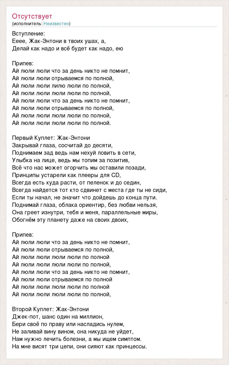 Вступление: Ееее, Жак-Энтони в твоих ушах, а, Делай как надо и всё будет как надо, ею Припев: Ай люли люли что за день никто не помнит, Ай люли люли отрываемся по полной, Ай люли люли лилю люли по полной, Ай люли люли люли люли по полной, Ай люли люли что за день никто не помнит, Ай люли люли отрываемся по полной, Ай люли люли люли люли по полной, Ай люли люли люли люли по полной. Первый Куплет: Жак-Энтони Закрывай глаза, сосчитай до десяти, Поднимаем зад ведь нам нехуй ловить в сети, Улыбка на лице, ведь мы топим за позитив, Всё что нас может огорчить мы оставили позади, Принципы устарели как плееры для CD, Всегда есть куда расти, от пеленок и до седин, Всегда найдется тот кто сдвинет с места где ты не сиди, Если ты начал, не значит что дойдешь до конца пути. Поднимай глаза, облака ориентир, без любви нельзя, Она греет изнутри, тебя и меня, параллельные миры, Обогнём эту планету даже на своих двоих, Припев: Ай люли люли что за день никто не помнит, Ай люли люли отрываемся по полной, Ай люли люли люли люли по полной Ай люли люли люли люли по полной, Ай люли люли что за день никто не помнит, Ай люли люли отрываемся по полной Ай люли люли люли люли по полной Ай люли люли люли люли по полной, Второй Куплет: Жак-Энтони Джек-пот, шанс один на миллион, Бери своё по праву или насладись нулем, Не заливай вину вином, она никуда не уйдет, Нам нужно лечить болезни, а мы ищем симптом. На мне висят три цепи, они сияют как принцессы.