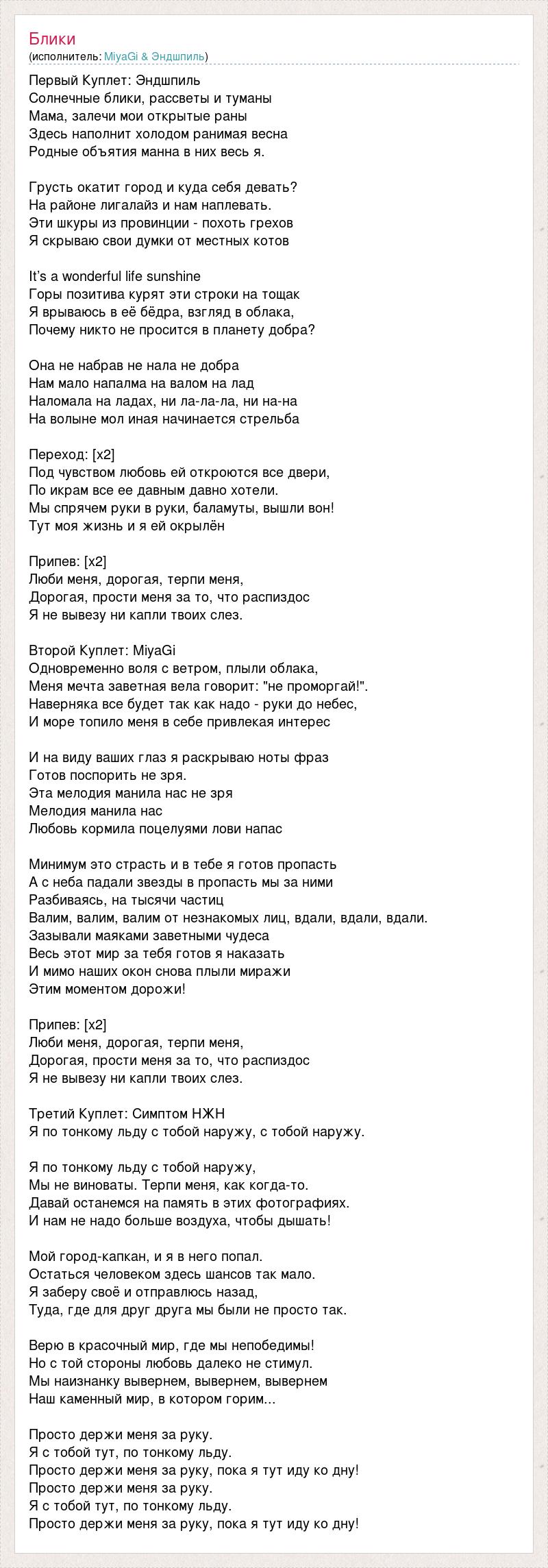 Первый Куплет: Эндшпиль Солнечные блики, рассветы и туманы Мама, залечи мои открытые раны Здесь наполнит холодом ранимая весна Родные объятия манна в них весь я. Грусть окатит город и куда себя девать? На районе лигалайз и нам наплевать. Эти шкуры из провинции - похоть грехов Я скрываю свои думки от местных котов It’s a wonderful life sunshine Горы позитива курят эти строки на тощак Я врываюсь в её бёдра, взгляд в облака, Почему никто не просится в планету добра? Она не набрав не нала не добра Нам мало напалма на валом на лад Наломала на ладах, ни ла-ла-ла, ни на-на На волыне мол иная начинается стрельба Переход: [х2] Под чувством любовь ей откроются все двери, По икрам все ее давным давно хотели. Мы спрячем руки в руки, баламуты, вышли вон! Тут моя жизнь и я ей окрылён Припев: [х2] Люби меня, дорогая, терпи меня, Дорогая, прости меня за то, что распиздос Я не вывезу ни капли твоих слез. Второй Куплет: MiyaGi Одновременно воля с ветром, плыли облака, Меня мечта заветная вела говорит: "не проморгай!". Наверняка все будет так как надо - руки до небес, И море топило меня в себе привлекая интерес И на виду ваших глаз я раскрываю ноты фраз Готов поспорить не зря. Эта мелодия манила нас не зря Мелодия манила нас Любовь кормила поцелуями лови напас Минимум это страсть и в тебе я готов пропасть А с неба падали звезды в пропасть мы за ними Разбиваясь, на тысячи частиц Валим, валим, валим от незнакомых лиц, вдали, вдали, вдали. Зазывали маяками заветными чудеса Весь этот мир за тебя готов я наказать И мимо наших окон снова плыли миражи Этим моментом дорожи! Припев: [х2] Люби меня, дорогая, терпи меня, Дорогая, прости меня за то, что распиздос Я не вывезу ни капли твоих слез. Третий Куплет: Симптом НЖН Я по тонкому льду с тобой наружу, с тобой наружу. Я по тонкому льду с тобой наружу, Мы не виноваты. Терпи меня, как когда-то. Давай останемся на память в этих фотографиях. И нам не надо больше воздуха, чтобы дышать! Мой город-капкан, и я в него попал. Остаться человеком здесь шансов так мало. Я заберу своё и отправлюсь назад, Туда, где для друг друга мы были не просто так. Верю в красочный мир, где мы непобедимы! Но с той стороны любовь далеко не стимул. Мы наизнанку вывернем, вывернем, вывернем Наш каменный мир, в котором горим... Просто держи меня за руку. Я с тобой тут, по тонкому льду. Просто держи меня за руку, пока я тут иду ко дну! Просто держи меня за руку. Я с тобой тут, по тонкому льду. Просто держи меня за руку, пока я тут иду ко дну!
