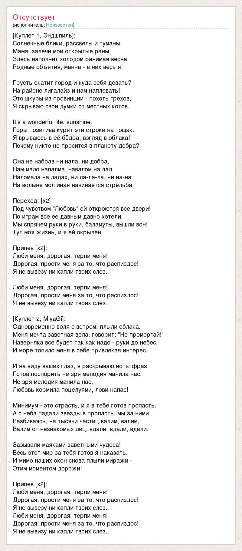 [Куплет 1, Эндшпиль]: Солнечные блики, рассветы и туманы. Мама, залечи мои открытые раны. Здесь наполнит холодом ранимая весна, Родные объятия, манна - в них весь я! Грусть окатит город и куда себя девать? На районе лигалайз и нам наплевать! Это шкуры из провинции - похоть грехов, Я скрываю свои думки от местных котов. It’s a wonderful life, sunshine. Горы позитива курят эти строки на тощак. Я врываюсь в её бёдра, взгляд в облака! Почему никто не просится в планету добра? Она не набрав ни нала, ни добра, Нам мало напалма, навалом на лад. Наломала на ладах, ни ла-ла-ла, ни на-на. На волыне мол иная начинается стрельба. Переход: [х2] Под чувством "Любовь" ей откроются все двери! По играм все ее давным давно хотели. Мы спрячем руки в руки, баламуты, вышли вон! Тут моя жизнь, и я ей окрылён. Припев [х2]: Люби меня, дорогая, терпи меня! Дорогая, прости меня за то, что распиздос! Я не вывезу ни капли твоих слез. Люби меня, дорогая, терпи меня! Дорогая, прости меня за то, что распиздос! Я не вывезу ни капли твоих слез. [Куплет 2, MiyaGi]: Одновременно воля с ветром, плыли облака. Меня мечта заветная вела, говорит: "Не проморгай!" Наверняка все будет так как надо - руки до небес, И море топило меня в себе привлекая интерес. И на виду ваших глаз, я раскрываю ноты фраз Готов поспорить не зря мелодия манила нас. Не зря мелодия манила нас. Любовь кормила поцелуями, лови напас! Минимум - это страсть, и я в тебе готов пропасть. А с неба падали звезды в пропасть, мы за ними Разбиваясь, на тысячи частиц валим, валим, Валим от незнакомых лиц, вдали, вдали, вдали. Зазывали маяками заветными чудеса! Весь этот мир за тебя готов я наказать. И мимо наших окон снова плыли миражи - Этим моментом дорожи! Припев [х2]: Люби меня, дорогая, терпи меня! Дорогая, прости меня за то, что распиздос! Я не вывезу ни капли твоих слез. Люби меня, дорогая, терпи меня! Дорогая, прости меня за то, что распиздос! Я не вывизу ни капли твоих слез...