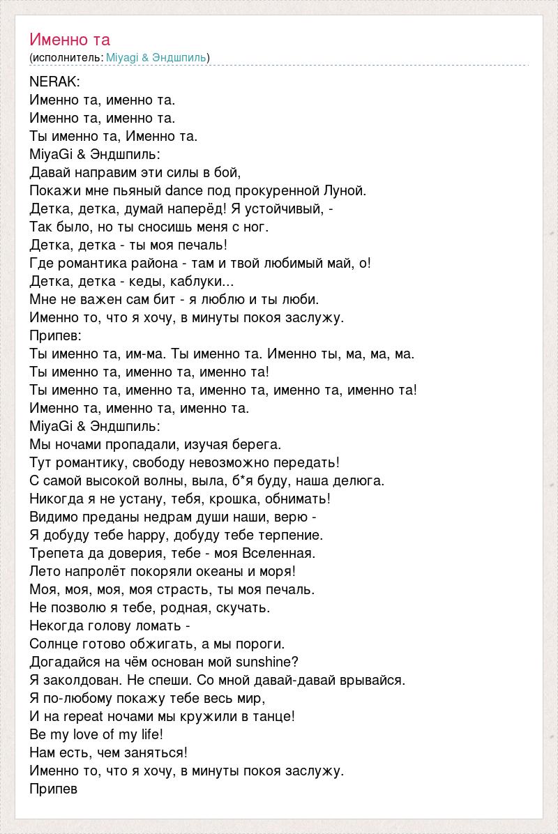 NERAK: Именно та, именно та. Именно та, именно та. Ты именно та, Именно та. MiyaGi & Эндшпиль: Давай направим эти силы в бой, Покажи мне пьяный dаnce под прокуренной Луной. Детка, детка, думай наперёд! Я устойчивый, - Так было, но ты сносишь меня с ног. Детка, детка - ты моя печаль! Где романтика района - там и твой любимый май, о! Детка, детка - кеды, каблуки... Мне не важен сам бит - я люблю и ты люби. Именно то, что я хочу, в минуты покоя заслужу. Припев: Ты именно та, им-ма. Ты именно та. Именно ты, ма, ма, ма. Ты именно та, именно та, именно та! Ты именно та, именно та, именно та, именно та, именно та! Именно та, именно та, именно та. MiyaGi & Эндшпиль: Мы ночами пропадали, изучая берега. Тут романтику, свободу невозможно передать! С самой высокой волны, выла, б*я буду, наша делюга. Никогда я не устану, тебя, крошка, обнимать! Видимо преданы недрам души наши, верю - Я добуду тебе happy, добуду тебе терпение. Трепета да доверия, тебе - моя Вселенная. Лето напролёт покоряли океаны и моря! Моя, моя, моя, моя страсть, ты моя печаль. Не позволю я тебе, родная, скучать. Некогда голову ломать - Солнце готово обжигать, а мы пороги. Догадайся на чём основан мой sunshine? Я заколдован. Не спеши. Со мной давай-давай врывайся. Я по-любому покажу тебе весь мир, И на repeat ночами мы кружили в танце! Be my love of my life! Нам есть, чем заняться! Именно то, что я хочу, в минуты покоя заслужу. Припев