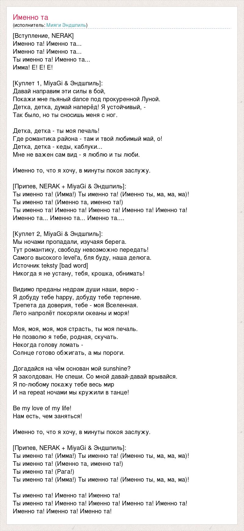 [Вступление, NERAK] Именно та! Именно та... Именно та! Именно та... Ты именно та! Именно та... Имма! Е! Е! Е! [Куплет 1, MiyaGi & Эндшпиль]: Давай направим эти силы в бой, Покажи мне пьяный dаnce под прокуренной Луной. Детка, детка, думай наперёд! Я устойчивый, - Так было, но ты сносишь меня с ног. Детка, детка - ты моя печаль! Где романтика района - там и твой любимый май, о! Детка, детка - кеды, каблуки... Мне не важен сам вид - я люблю и ты люби. Именно то, что я хочу, в минуты покоя заслужу. [Припев, NERAK + MiyaGi & Эндшпиль]: Ты именно та! (Имма!) Ты именно та! (Именно ты, ма, ма, ма)! Ты именно та! (Именно та, именно та!) Ты именно та! Именно та! Именно та! Именно та! Именно та! Именно та... Именно та... Именно та.... [Куплет 2, MiyaGi & Эндшпиль]: Мы ночами пропадали, изучаяя берега. Тут романтику, свободу невозможно передать! Самого высокого level'а, бля буду, наша делюга. Никогда я не устану, тебя, крошка, обнимать! Видимо преданы недрам души наши, верю - Я добуду тебе happy, добуду тебе терпение. Трепета да доверия, тебе - моя Вселенная. Лето напролёт покоряли океаны и моря! Моя, моя, моя, моя страсть, ты моя печаль. Не позволю я тебе, родная, скучать. Некогда голову ломать - Солнце готово обжигать, а мы пороги. Догадайся на чём основан мой sunshine? Я заколдован. Не спеши. Со мной давай-давай врывайся. Я по-любому покажу тебе весь мир И на repeat ночами мы кружили в танце! Be my love of my life! Нам есть, чем заняться! Именно то, что я хочу, в минуты покоя заслужу. [Припев, NERAK + MiyaGi & Эндшпиль]: Ты именно та! (Имма!) Ты именно та! (Именно ты, ма, ма, ма)! Ты именно та! (Именно та, именно та!) Ты именно та! (Рага!) Ты именно та! (Имма!) Ты именно та! (Именно ты, ма, ма, ма)! Ты именно та! Именно та! Именно та! Ты именно та! Именно та! Именно та! Именно та! Именно та! Именно та! Именно та! Именно та!