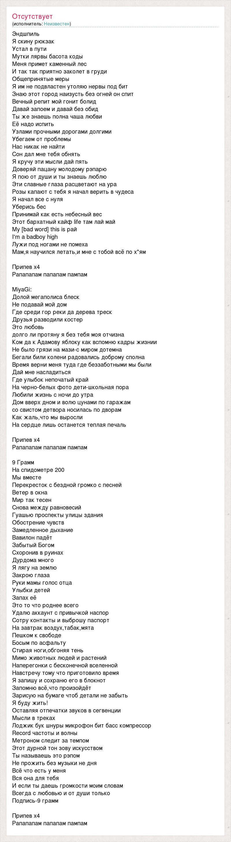 Эндшпиль Я скину рюкзак Устал в пути Мутки лярвы басота коды Меня примет каменный лес И так так приятно заколет в груди Общепринятые меры Я им не подвластен утоляю нервы под бит Знаю этот город наизусть без огней он спит Вечный репит мой гонит болид Давай запоем и давай без обид Ты же знаешь полна чаша любви Её надо испить Узлами прочными дорогами долгими Убегаем от проблемы Нас никак не найти Сон дал мне тебя обнять Я кручу эти мысли дай пять Доверяй пацану молодому рэпарю Я пою от души и ты знаешь люблю Эти славные глаза расцветают на ура Розы капают с тебя я начал верить в чудеса Я начал все с нуля Уберись бес Принимай как есть небесный вес Этот бархатный кайф life там лай май My [bad word] this is рай I'm a badboy high Лужи под ногами не помеха Мам,я научился летать,и мне с тобой всё по х*ям Припев x4 Рапапапам папапам пампам MiyaGi: Долой мегаполиса блеск Не подавай мой дом Где среди гор реки да дерева треск Друзья разводили костер Это любовь долго ли протяну я без тебя моя отчизна Ком да к Адамову яблоку как вспомню кадры жизнии Не было грязи на мази-с миром дотемна Бегали били колени радовались доброму сполна Время верни меня туда где беззаботными мы были Дай мне насладиться Где улыбок непочатый край На черно-белых фото дети-школьная пора Любили жизнь с ночи до утра Дом вверх дном и волю цунами по гаражам со свистом детвора носилась по дворам Как жаль,что мы выросли На сердце лишь останется теплая печаль Припев x4 Рапапапам папапам пампам 9 Грамм На спидометре 200 Мы вместе Перекресток с бездной громко с песней Ветер в окна Мир так тесен Снова между равновесий Гуашью проспекты улицы здания Обострение чувств Замедленное дыхание Вавилон падёт Забытый Богом Схоронив в руинах Дурдома много Я лягу на землю Закрою глаза Руки мамы голос отца Улыбки детей Запах её Это то что роднее всего Удалю аккаунт с привычкой наспор Сотру контакты и выброшу паспорт На завтрак воздух,табак,мята Пешком к свободе Босым по асфальту Стирая ноги,обгоняя тень Мимо животных людей и растений Наперегонки с бесконечной вселенной Навстречу тому что приготовило время Я запишу и сохраню его в блокнот Запомню всё,что произойдёт Зарисую на бумаге чтоб детали не забыть Я буду жить! Оставляя отпечатки звуков в сегвенции Мысли в треках Лоджик бук шнуры микрофон бит басс компрессор Record частоты и волны Метроном следит за темпом Этот дурной тон зову искусством Ты называешь это рэпом Не прожить без музыки не дня Всё что есть у меня Вся она для тебя И если ты даешь громкости моим словам Всегда с любовью и от души только Подпись-9 грамм Припев x4 Рапапапам папапам пампам